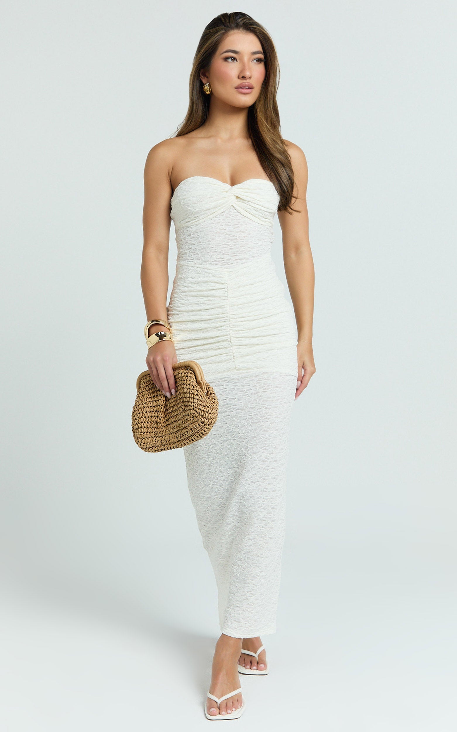 The strapless twist front and sheer textured jersey channel runway-worthy energy, while the curve-skimming silhouette brings major main character vibes to your next occasion.