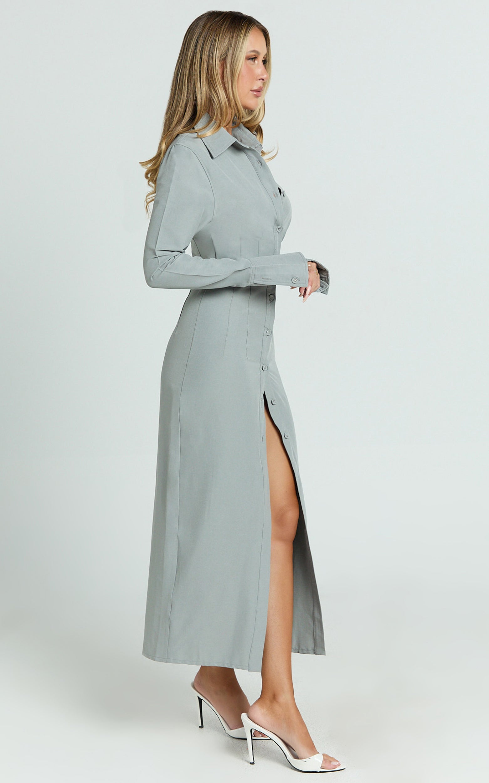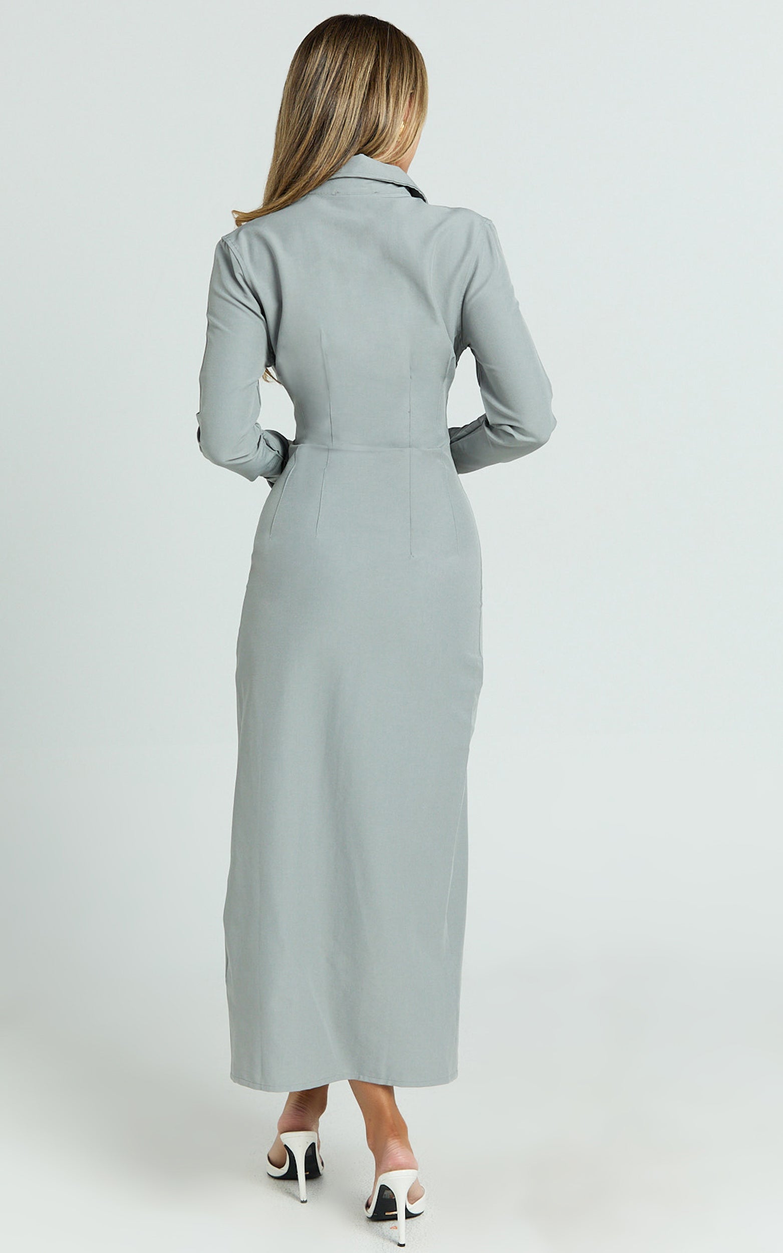 Crafted in sleek, light grey fabric, this slim-fitting shirt dress captures minimalist sophistication and effortlessly flatters your figure. Its button-down front and refined collar detail offer subtle elegance inspired by runway trends, making it an essential, versatile piece for your wardrobe.