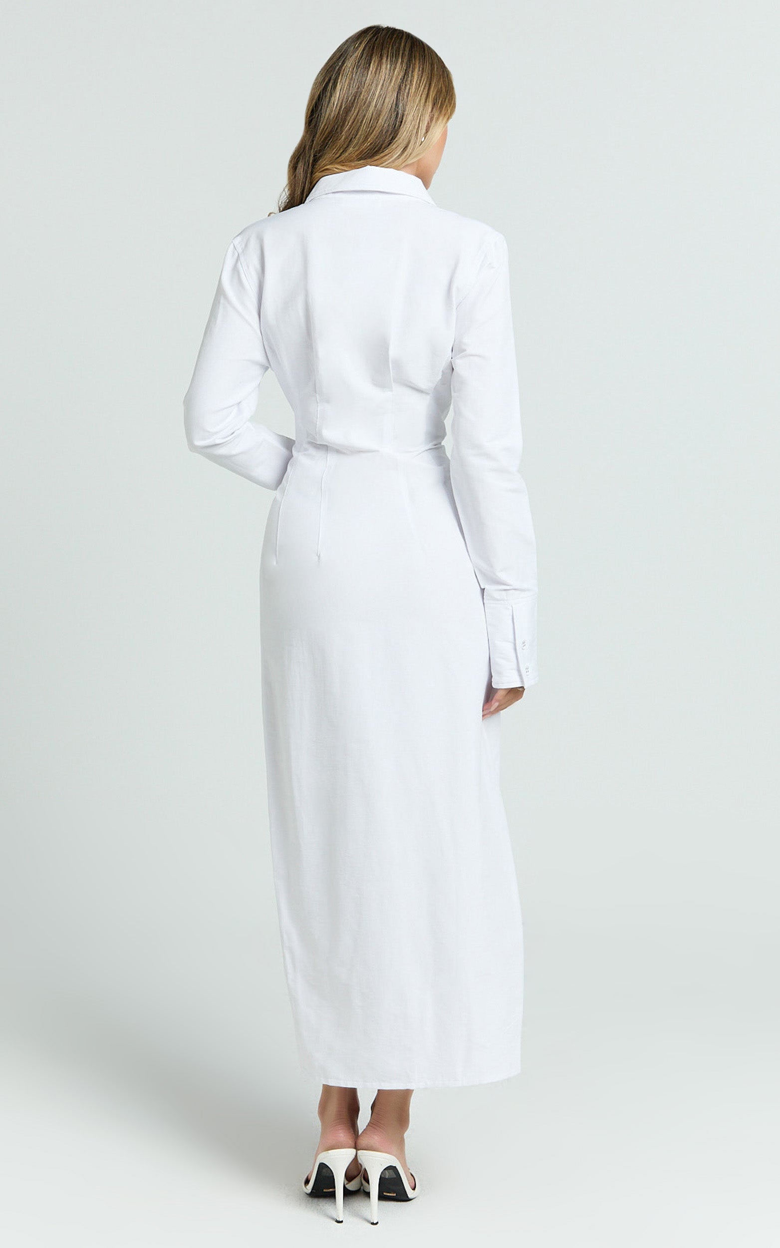 This slim white shirt dress nails the polished-meets-playful brief with a button-through front, sharp collar, and a curve-skimming midi silhouette that loves sneakers by day and heels by night. Think office-to-out cocktails without the outfit change, she’s refined, flirty, and totally effortless.