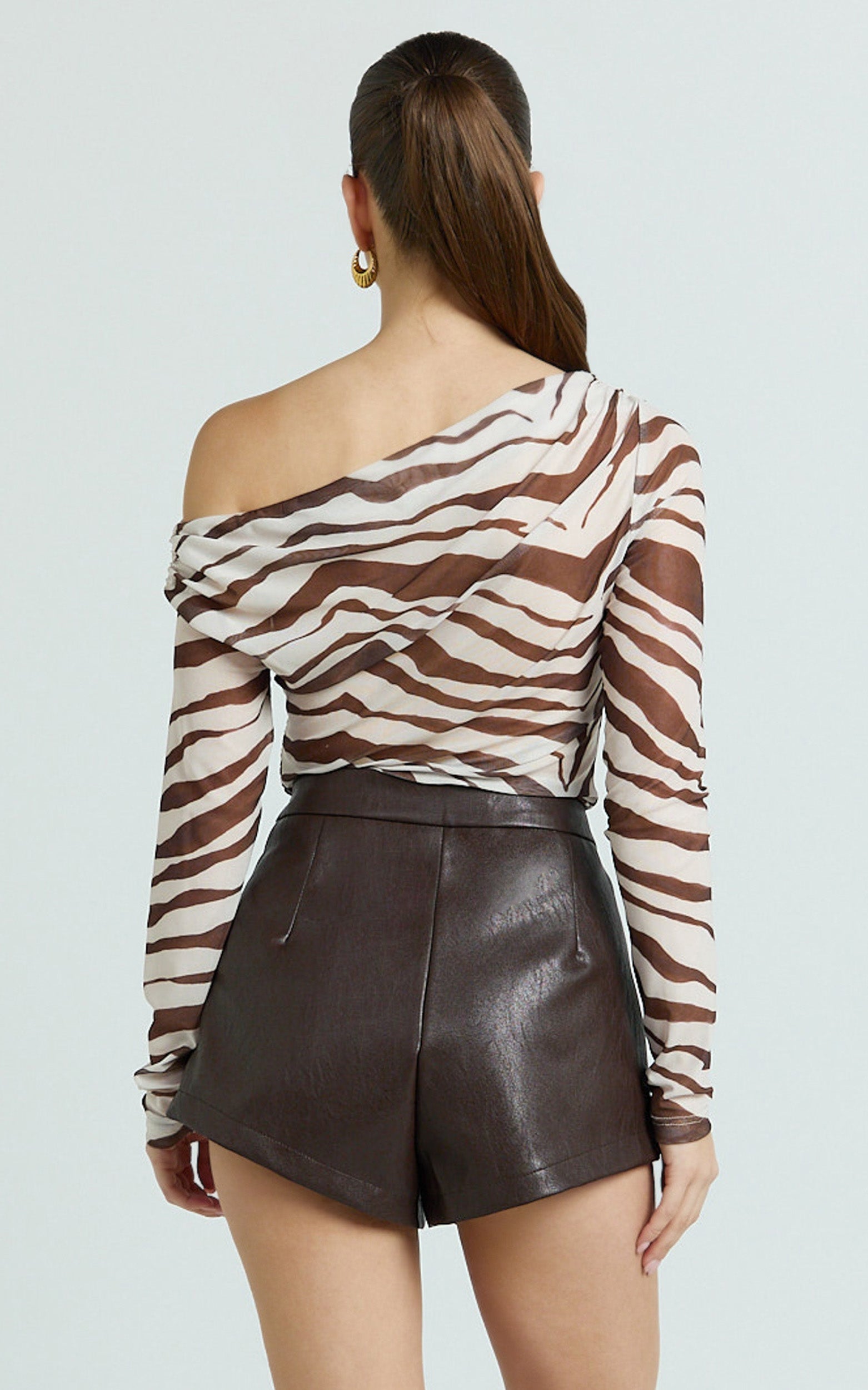 The sheer zebra pattern in dark brown gives that sultry, skin-kissed look while the asymmetric neckline frames your décolletage to perfection. It’s the kind of statement Tops piece that slips seamlessly into your rotation, dressy, daring, and totally wearable.