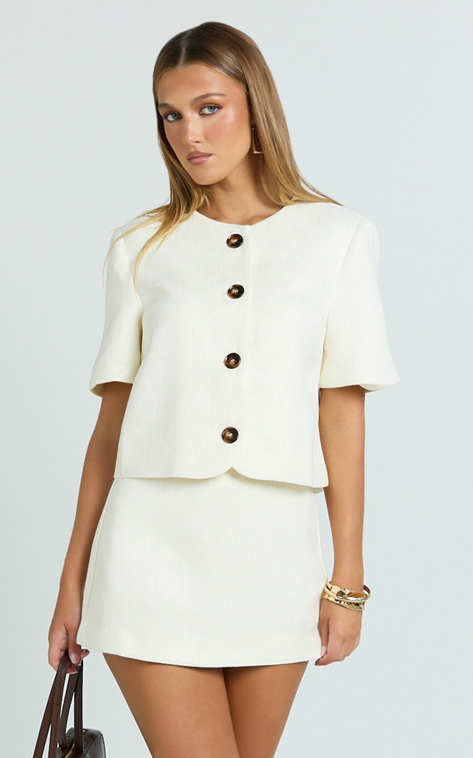 With clean lines, a tailored silhouette and snap-front ease, it nails that modern Jackets vibe, think smart, minimal, and endlessly wearable. The soft cream tone pairs seamlessly with butter yellow accents and plays beautifully with polka dots for a fresh, trend-forward look.