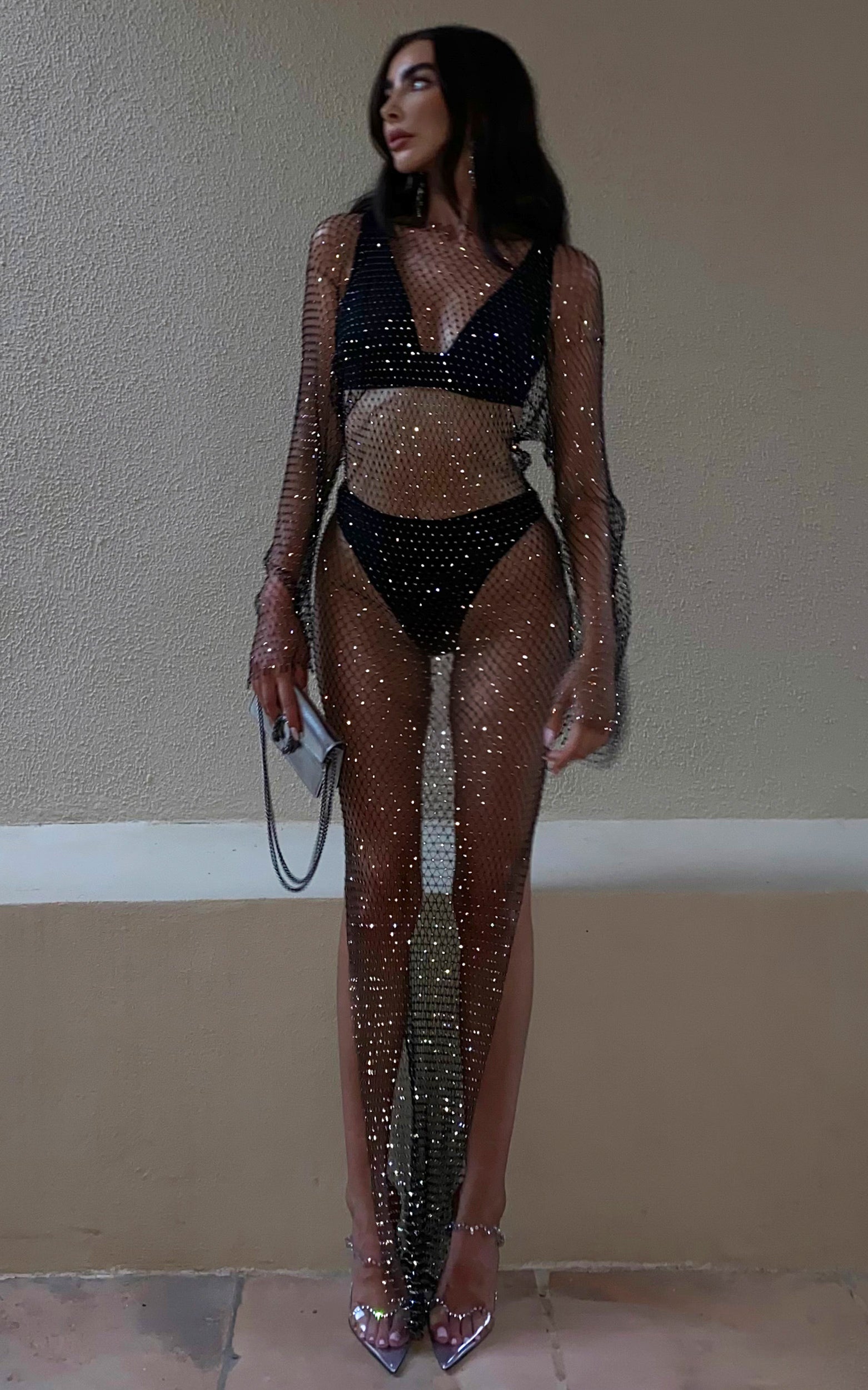 Go bold this party season with the Hanica Dress! This skin-baring maxi features diamante detailing, a high neckline, long flared sleeves and side splits on each side. It's a risqué piece that is perfect for layering and will have you serving body-ody-ody.