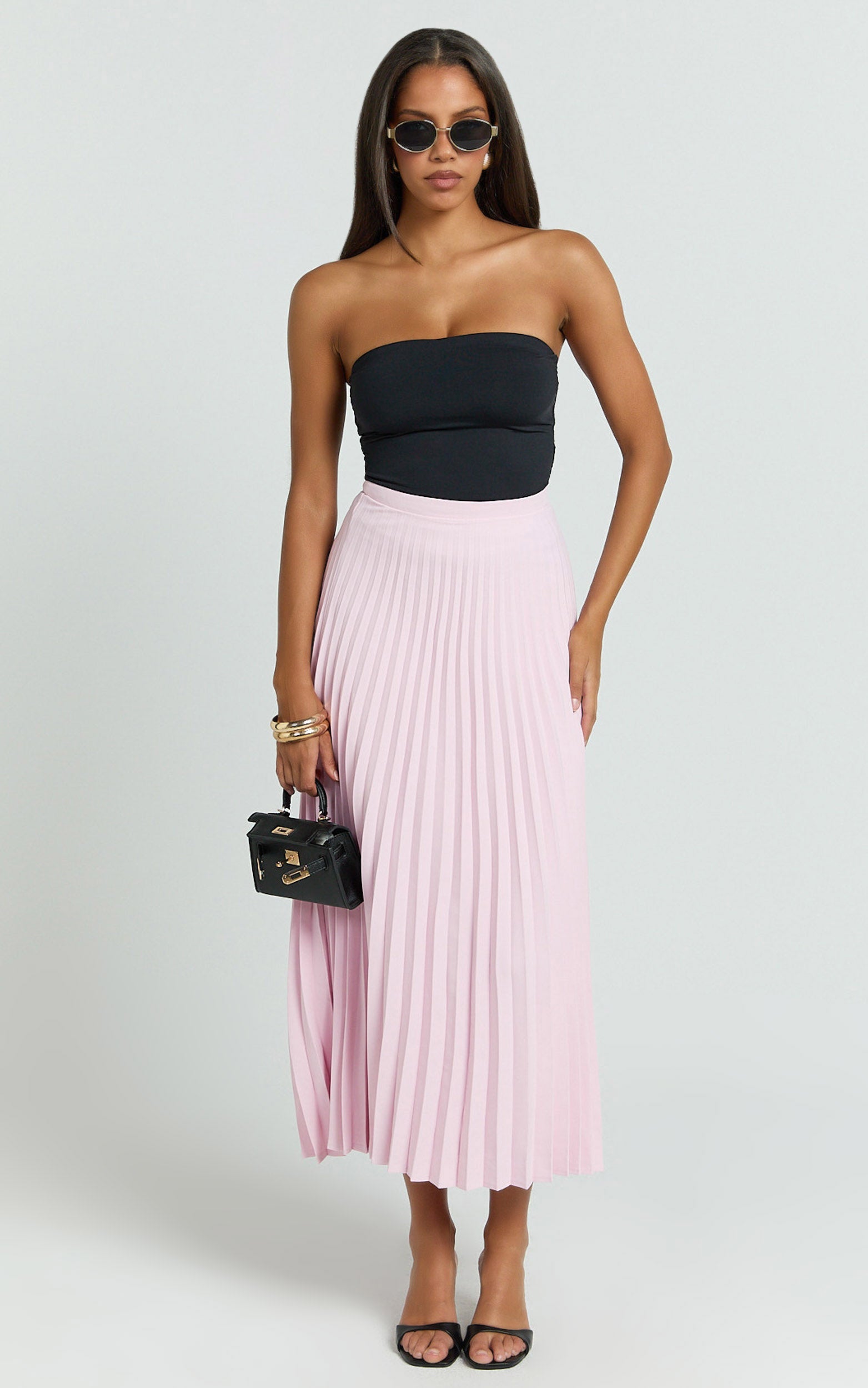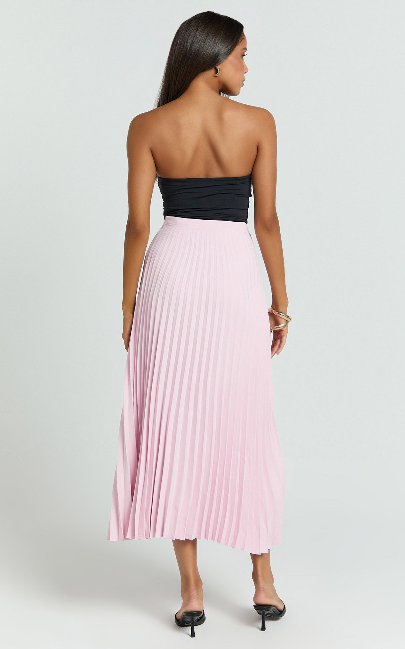 Harlee Midi Skirt - Pleated High Waist A Line Skirt In Baby Pink is your go-to for polished ease. The flattering midi length balances cute and chic, and the clean waistband keeps the look sleek under fitted tops. Style with a trench coat for trans-seasonal layering or embrace naked dressing-inspired minimalism with a simple cami and barely-there heels. A forever-fave in the Skirts rotation.