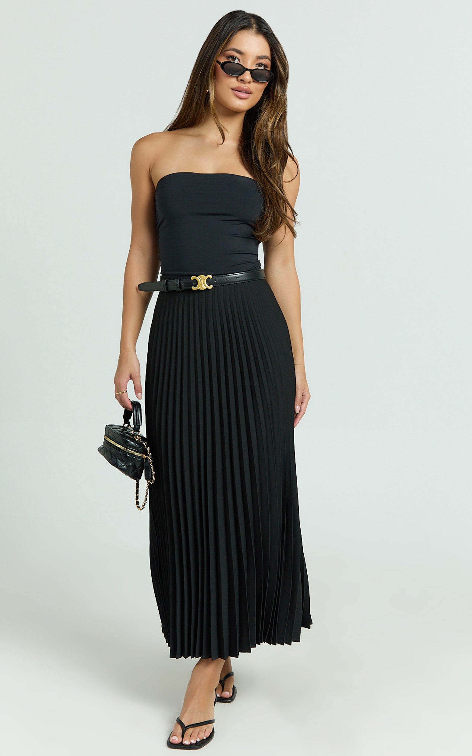 This high-waist Black midi serves sharp pleats and a swishy hem for instant polish, desk to dinner, no outfit change needed. Style with ballet flats to nod to quiet luxury, or pair with a crisp tee for a clean Skirts moment that still feels effortless.