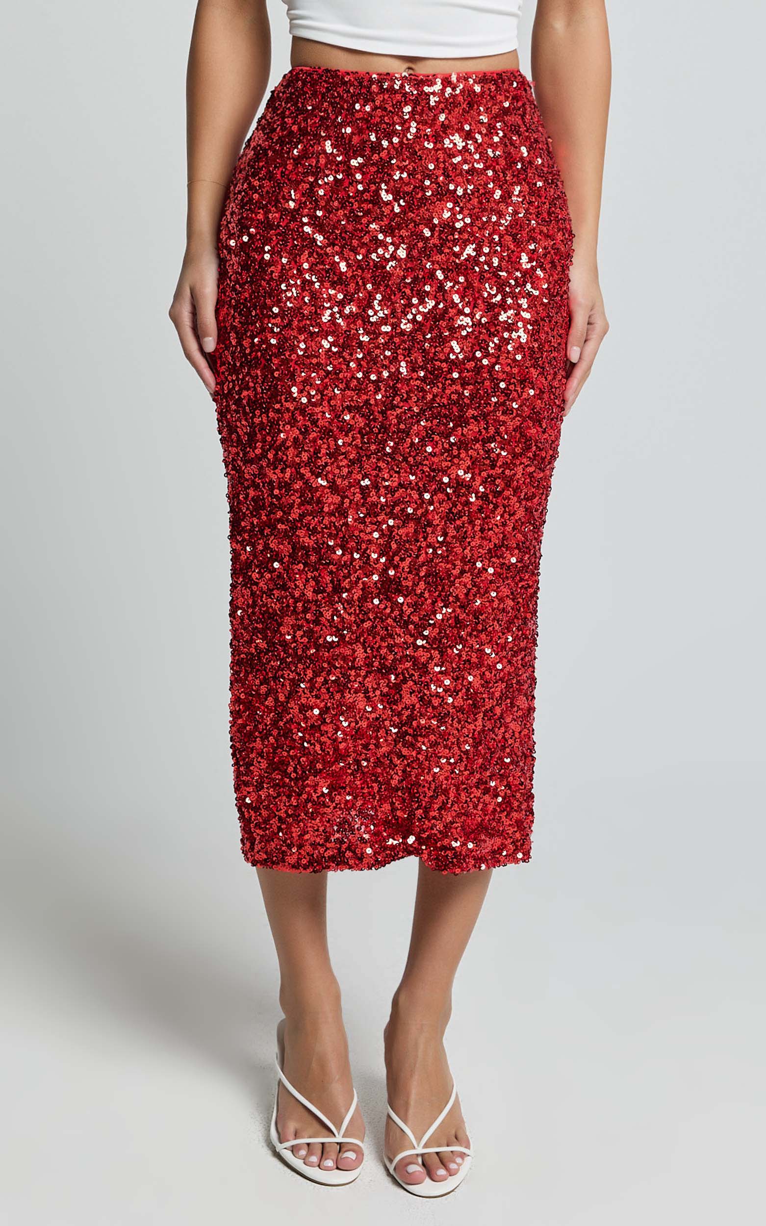 Get ready to turn heads on the dance floor with our Hasley Midi Skirt! This flirty and playful red sequin bodycon skirt is perfect for all your party needs. Made from high-quality polyester, it hugs your curves in all the right places while adding a touch of sparkle to your outfit. With its midi length, this skirt is both trendy and versatile, allowing you to easily dress up or down for any occasion. So why wait? Step into the spotlight and let our Hasley Midi Skirt be the star of every party!