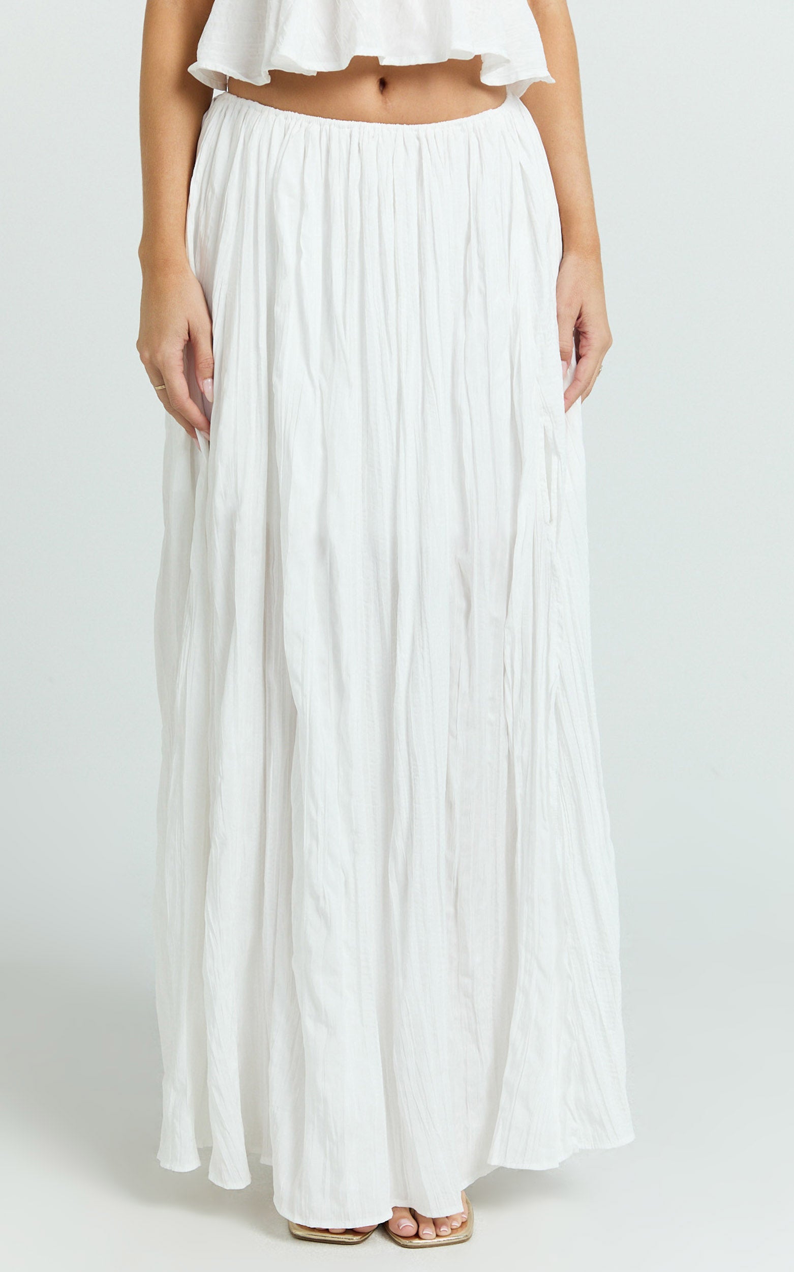 With an elastic waist for comfort and a side split for that leg-lengthening moment, it delivers an elongated silhouette that moves effortlessly from day to drinks. Skirts like this go from beach walks to brunch without trying too hard, and the crisp white hue keeps it fresh and versatile.