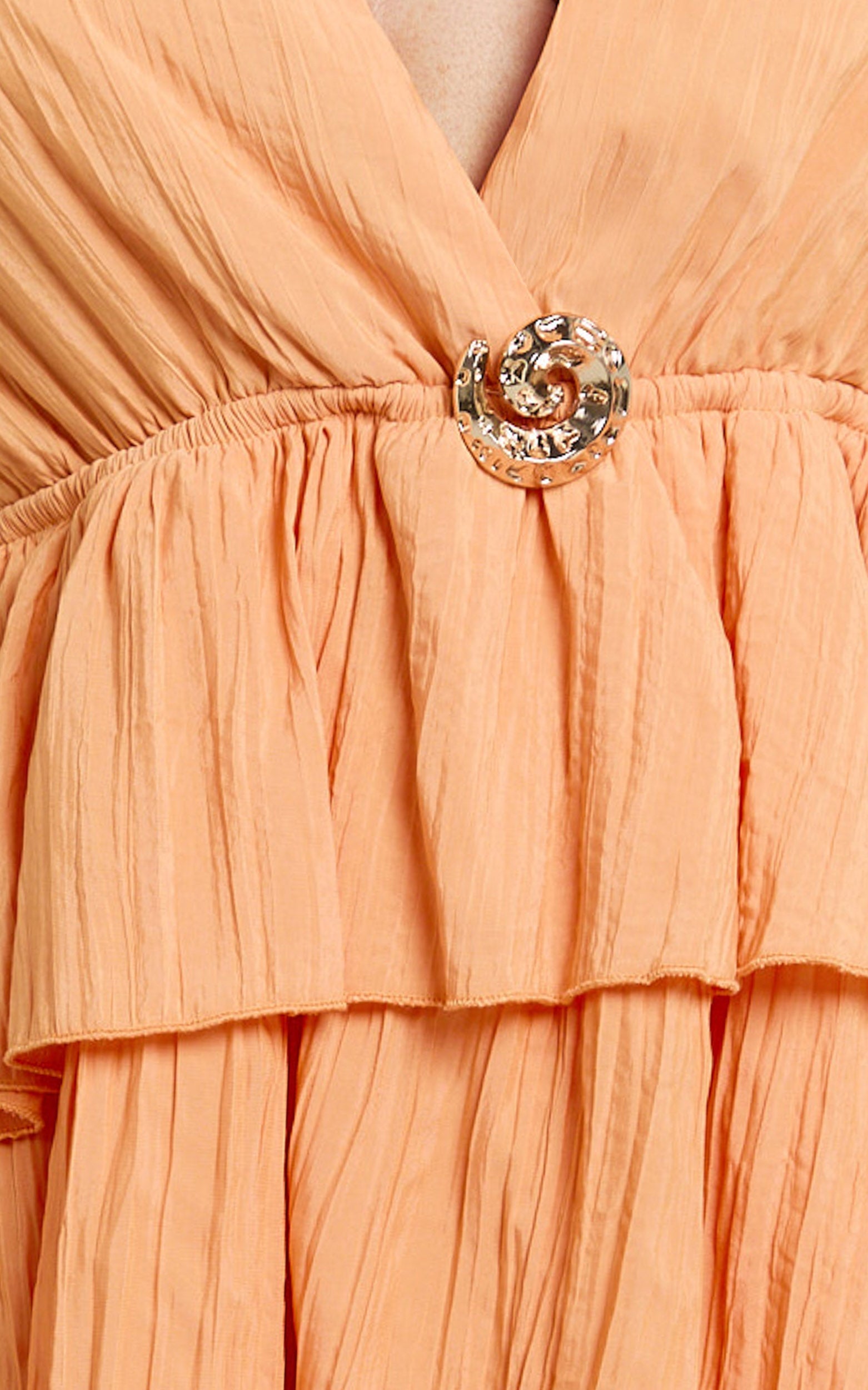 This orange mini serves a plunge halter neckline, waist-cinching fit and flare, and a flirty peplum with a glinting brooch detail that delivers instant party energy. Think dance-floor twirl factor, leg-lengthening hem, and a bold pop of colour that photographs beautifully for nights out and special events. Trending notes? A little Vintage 90s and Y2K attitude meets the ease of breezy dresses, fun, flirty, and made to turn heads.