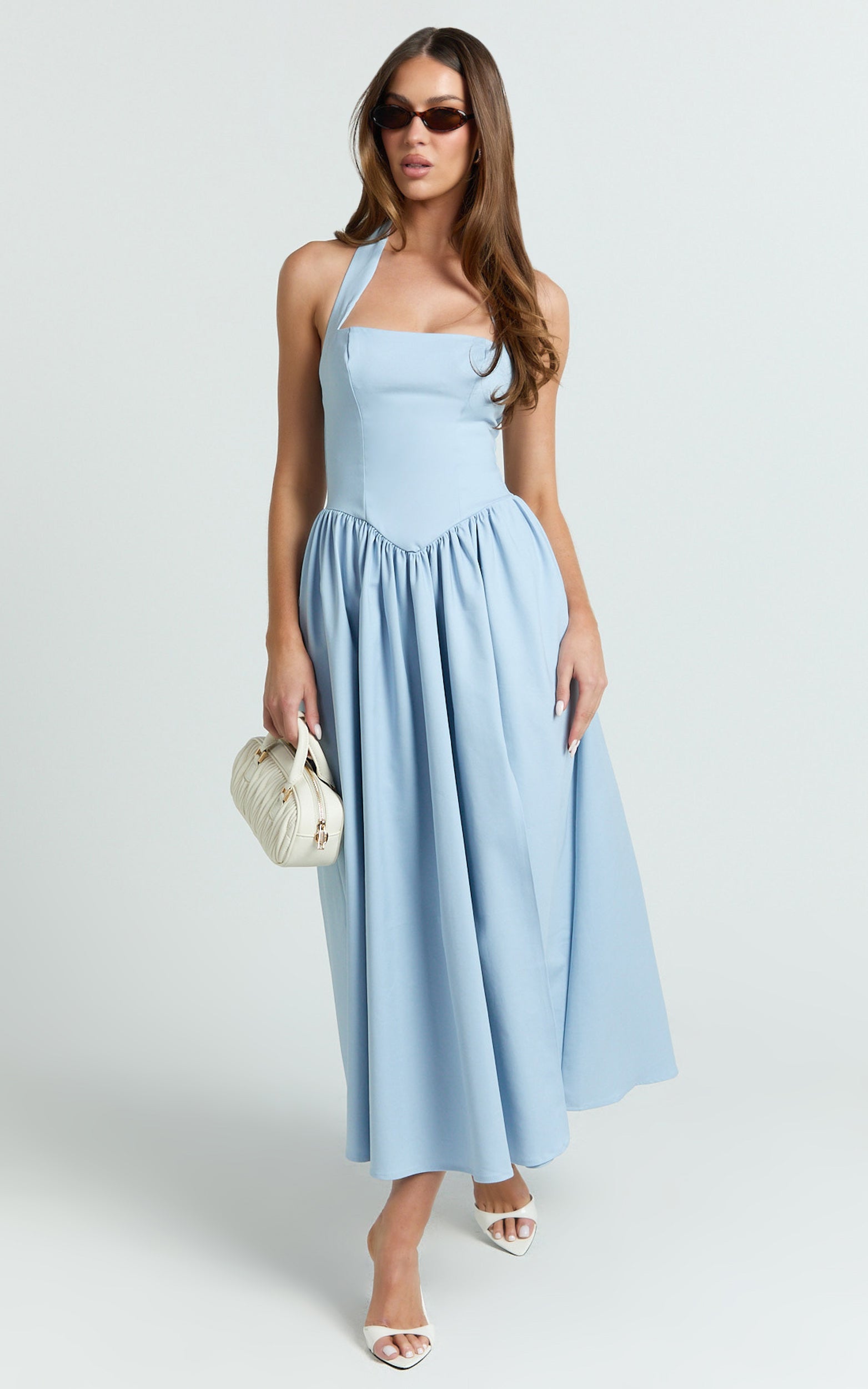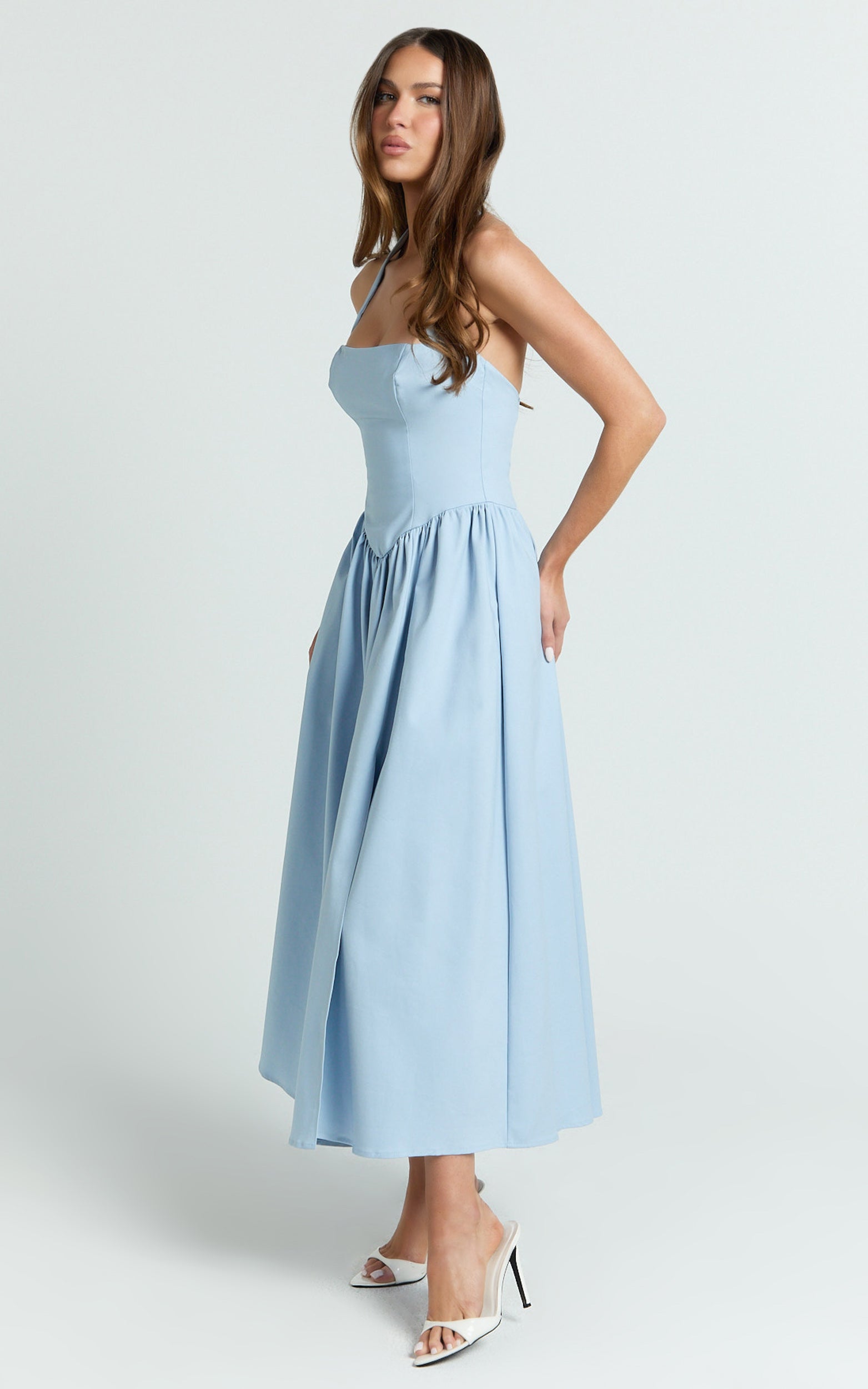 The halter tie neck and corset panel detailing sculpt the figure for an ultra-flattering fit, nodding to coquette style dresses that are trending across every virtual fashion show feed. Sultry yet sweet, it’s perfect for event dressing or date nights, just swap your look from day to evening with strappy heels and dainty hoop earrings.