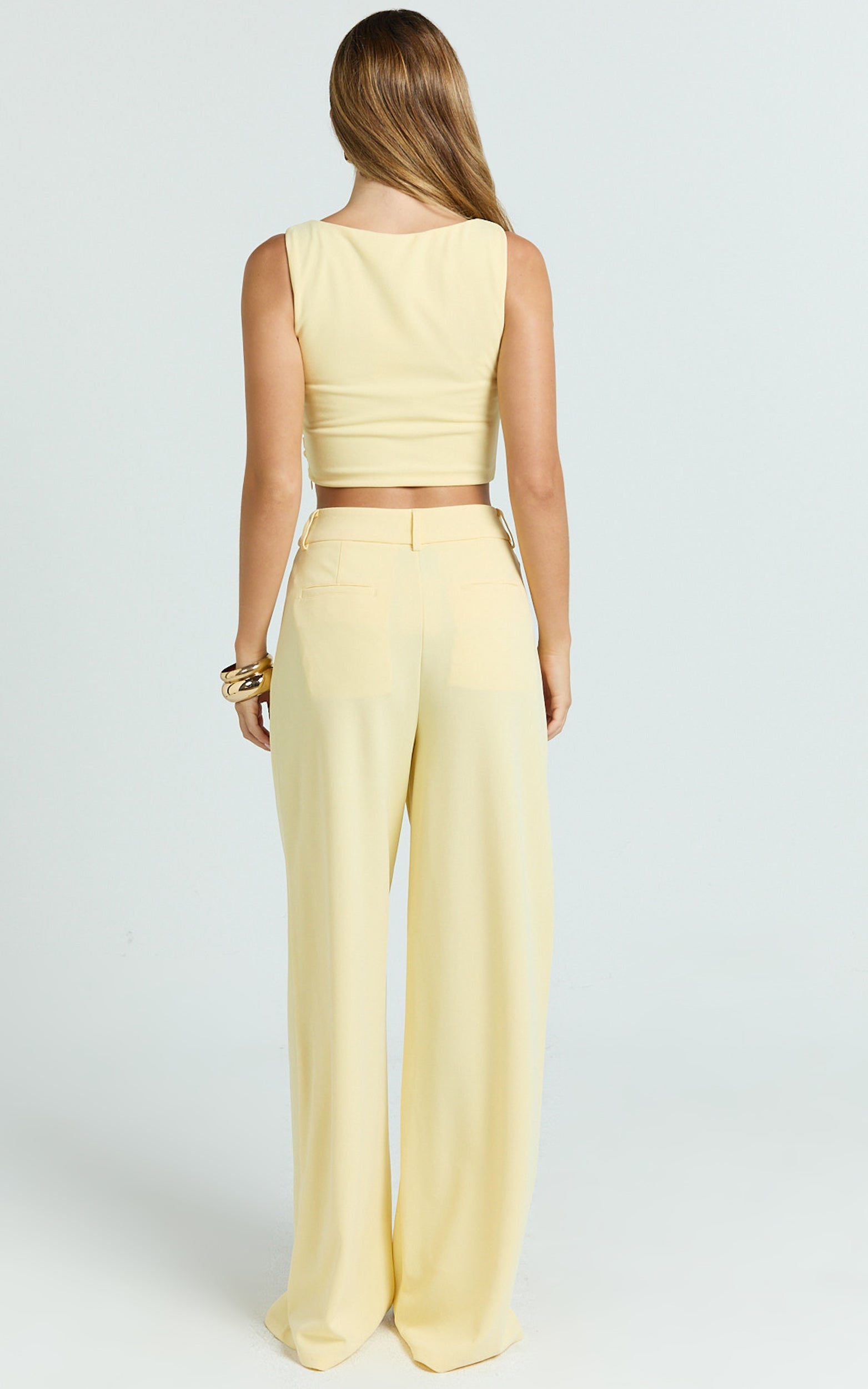 The Helen Two Piece Set in Pastel Yellow features a twisted crop top and wide-leg pants that elongate your frame while putting a fresh spin on the season’s pastel-butter hue. Whether you dress it up or keep it cool, this co-ord is an instant vibe. Style her with strappy block heels, gold huggies, and a mini top-handle bag for a polished daytime edit, or swap in platform sandals for a more casual feel. The wide leg moves with you, while the twist detail cinches and shapes for a flattering finish. Consider it your shortcut to an all-eyes-on-you look, polished, playful, and ready to go.