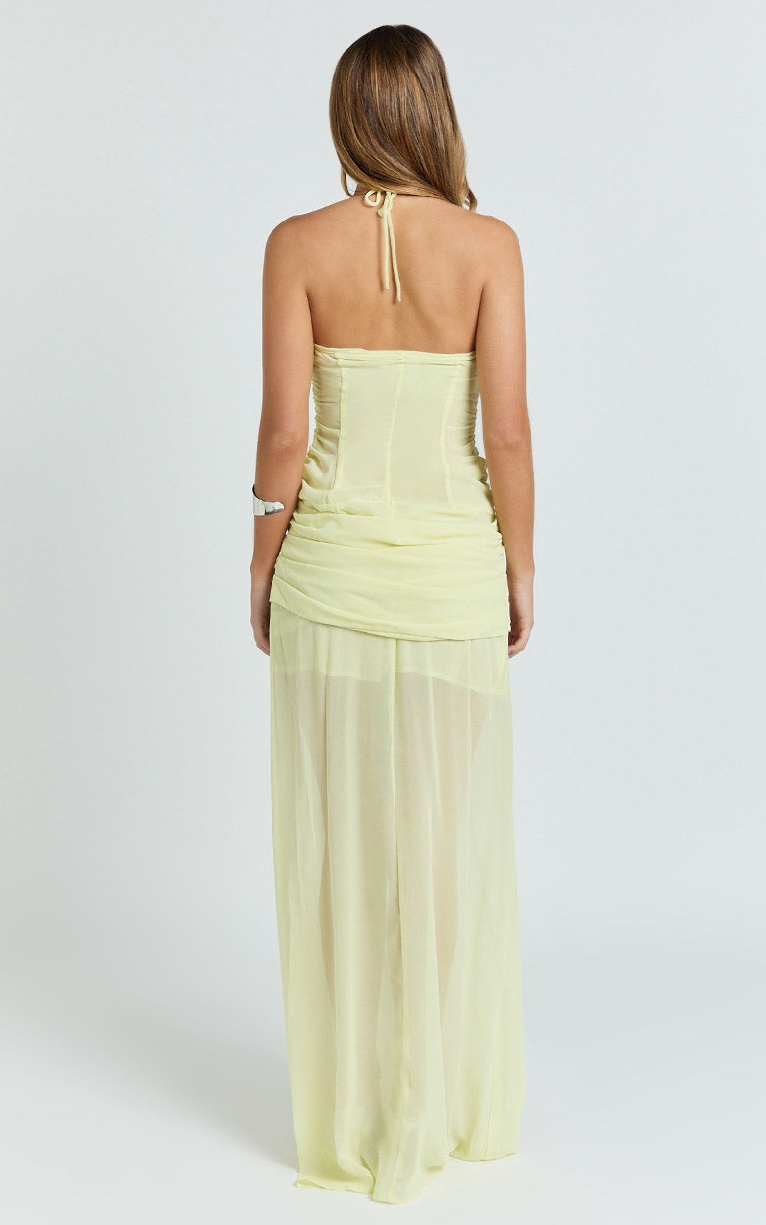 This halter beauty serves a sleek draped skirt and waist-defining silhouette in a zesty Yellow that pops for weddings, long lunches and dance floors. The fluid movement feels elegant yet flirty, while the open neckline frames your glow, pair with pendant necklaces for that minimal-luxe finish. A subtle nod to Balletcore in the soft flow and cinch, it’s made to flatter from every angle.