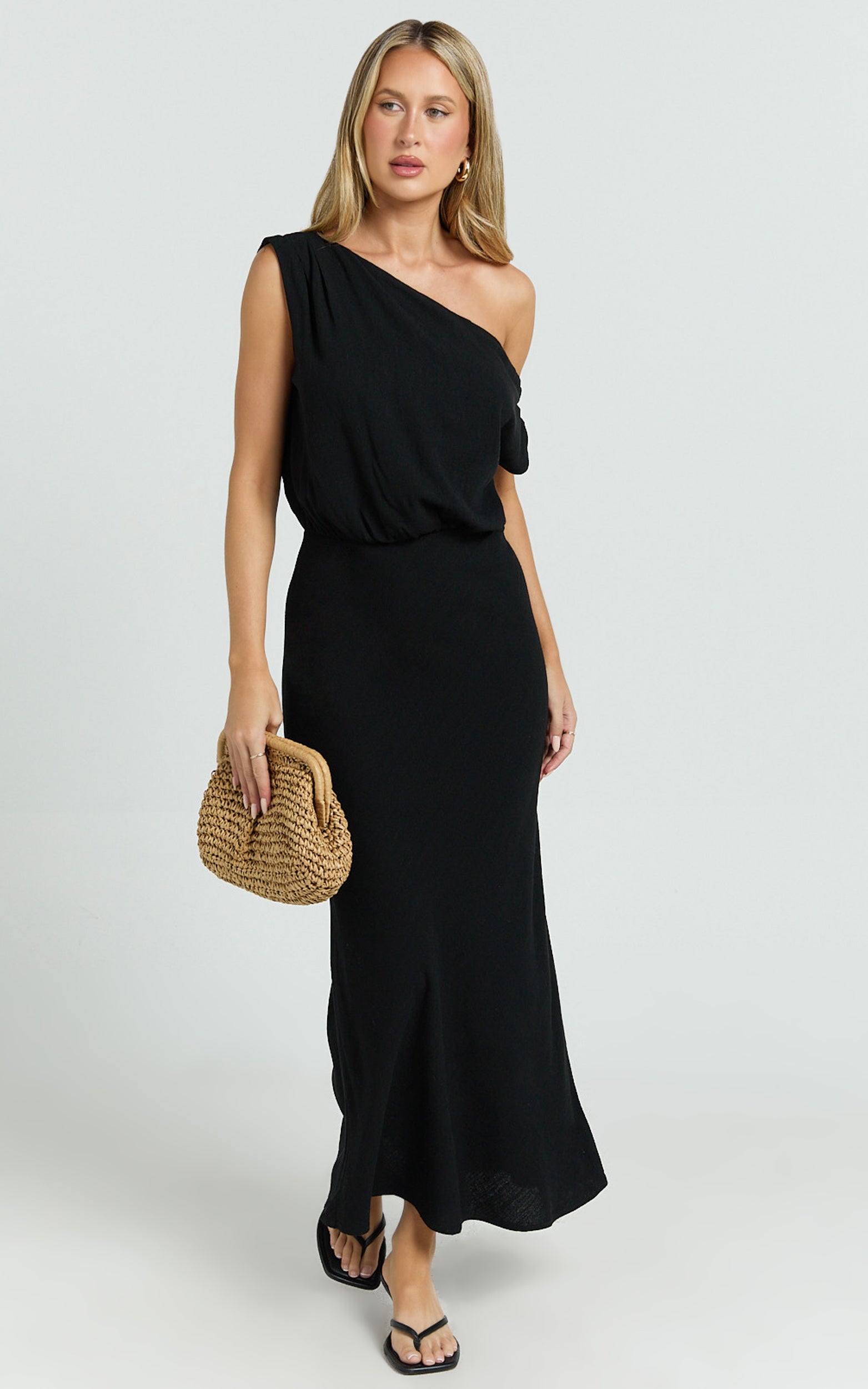 A chic midi that effortlessly blends runway glamour with minimalist sophistication, this timeless black linen number features an eye-catching one-shoulder neckline that's sure to turn heads wherever you go. From cocktail hour to weekend brunch with the girls, this elegant dress will have you standing out in style.
