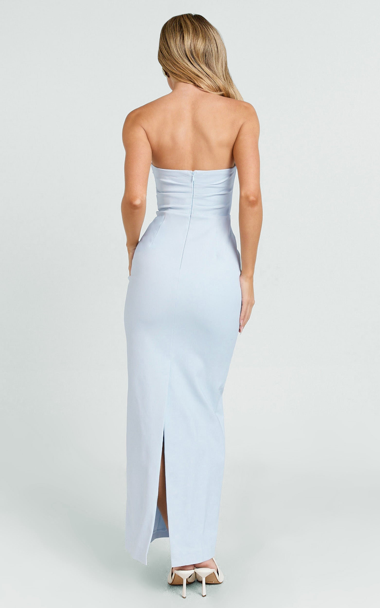 Strapless, ruched, and cut to a fitted column, this midi brings body-hugging vibes with minimal effort, perfect for weddings, nights out, and every “cute but classy” moment. The silhouette channels Quiet Luxury with clean lines and a sleek finish, while the saturated hue keeps it party-ready. Consider it your polished alternative to Dresses that try too hard.