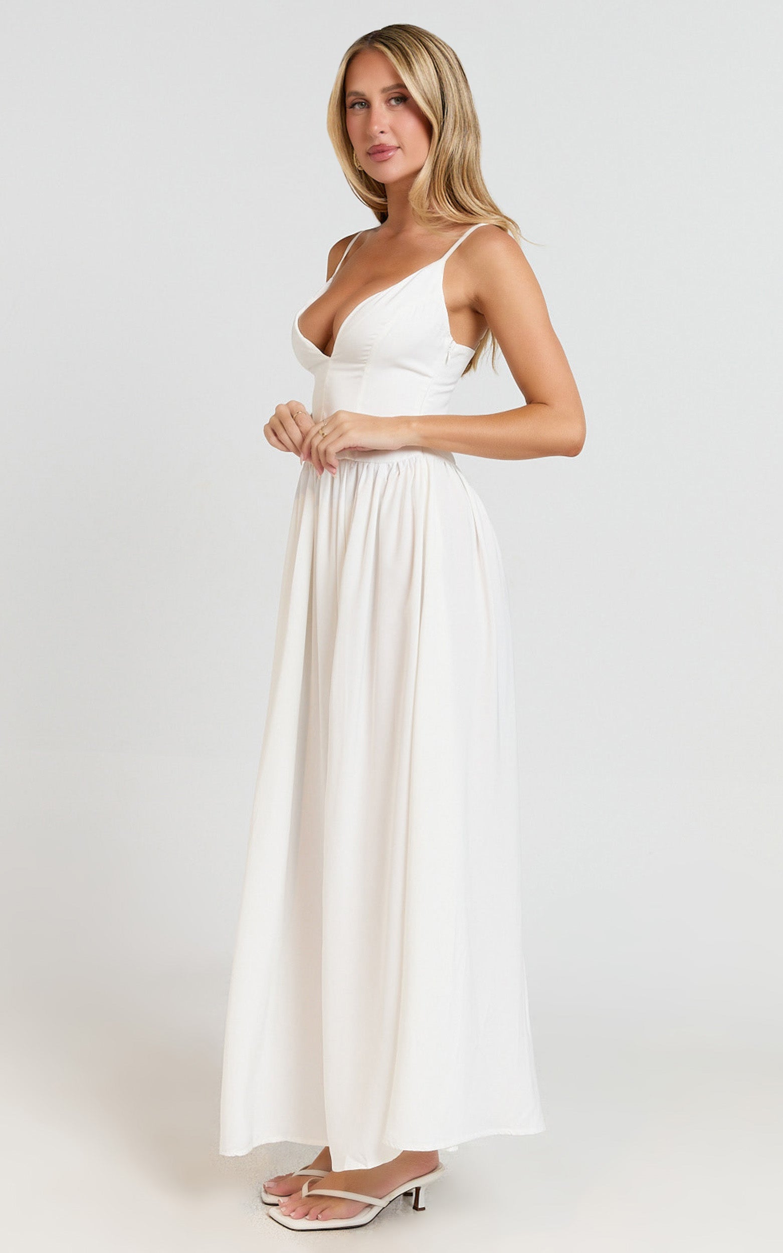 Jamilla turns every entrance into a moment, think aisle, rooftop or sunset soirée. The fluid silhouette and high leg split keep it flirty yet refined, while the clean off white palette lets your accessories shine. Add delicate hoops and a slick bun to keep the focus on that plunging neckline and statement split, and you’re set.
