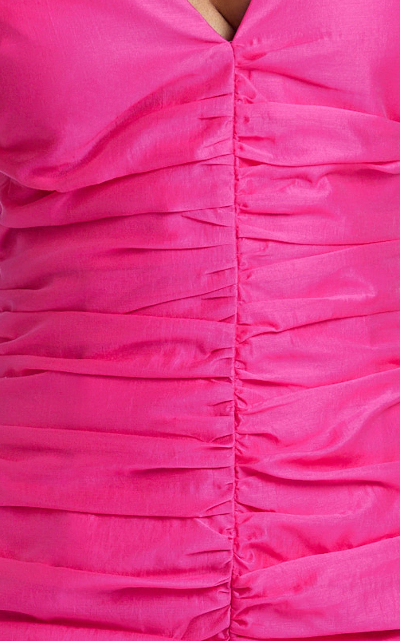 This mini features a softly gathered V neckline and a curve-accenting silhouette that skims then flares, made to flatter from brunch to girls’ night. Think dancing-friendly length, photo-ready shape, and the kind of easy polish that pairs with your favourite Dresses in high rotation.