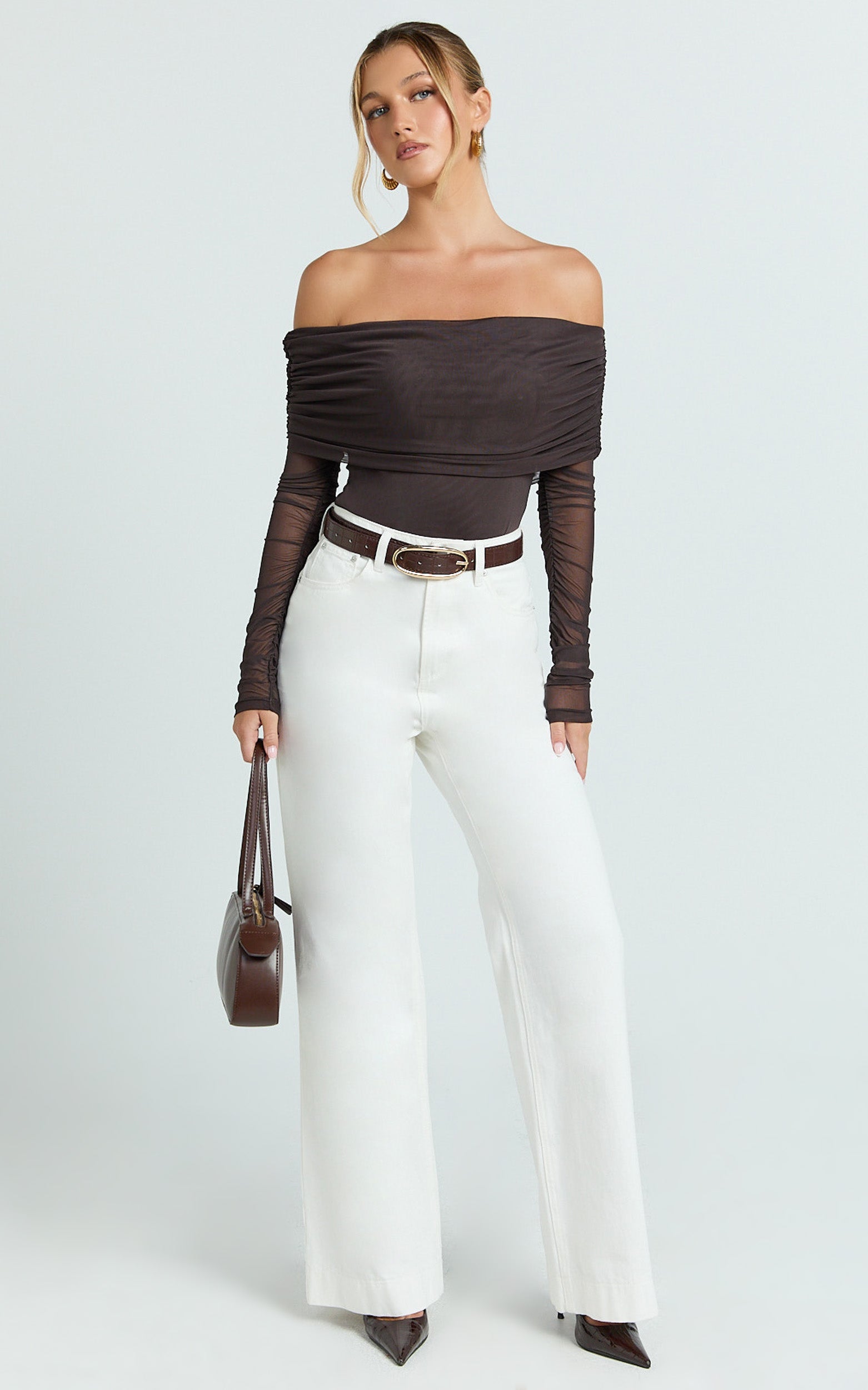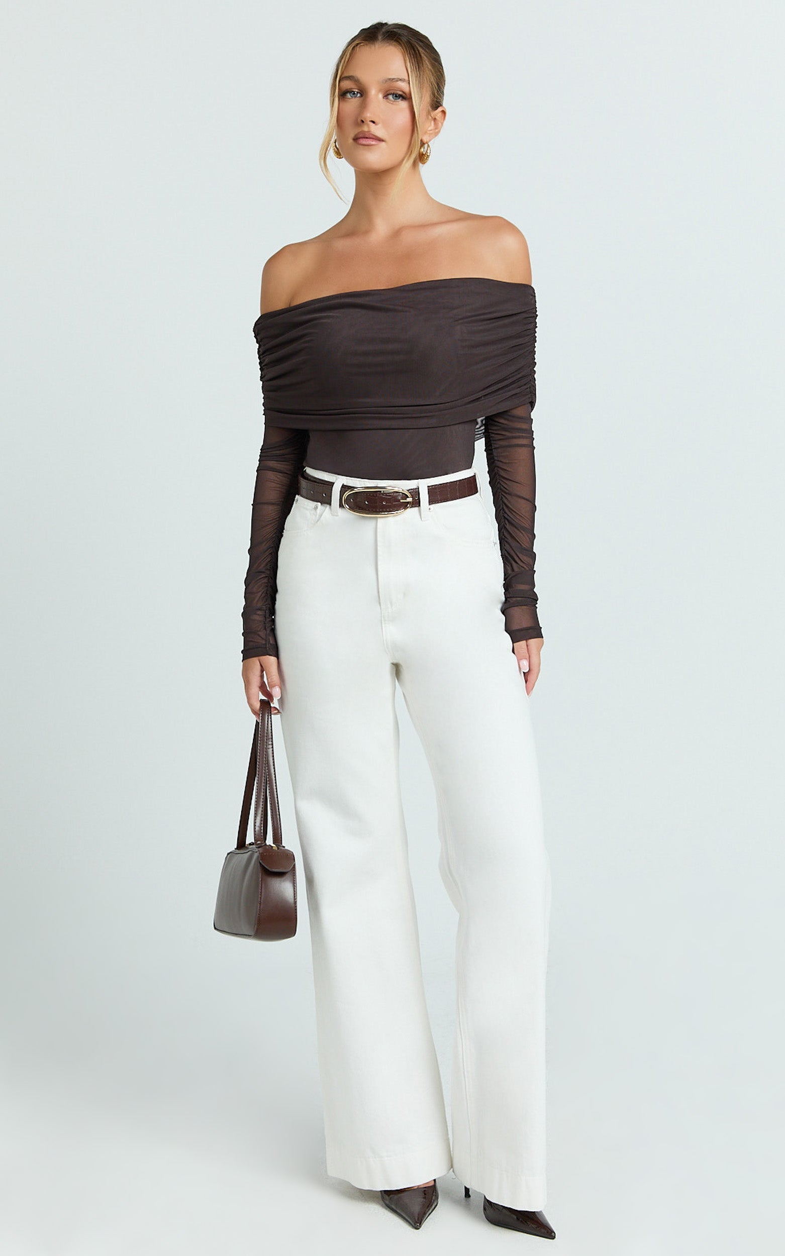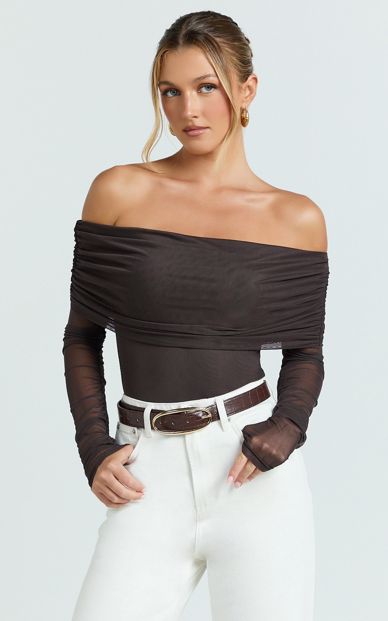 The Jaythen Bodysuit in Chocolatte serves a second-skin fit with sculpting ruching through the waist and sheer long sleeves for just-right allure. The off-shoulder neckline frames your collarbones beautifully, giving a feminine finish that feels polished from every angle. Style it with slouchy denim and sleek heels for a cool night-out formula, or tuck into a mini skirt when you want that flirty, lace-trim-inspired vibe without the fuss. The rich chocolate tone makes it a versatile styling staple, flattering, sultry, and ready for repeat wear.