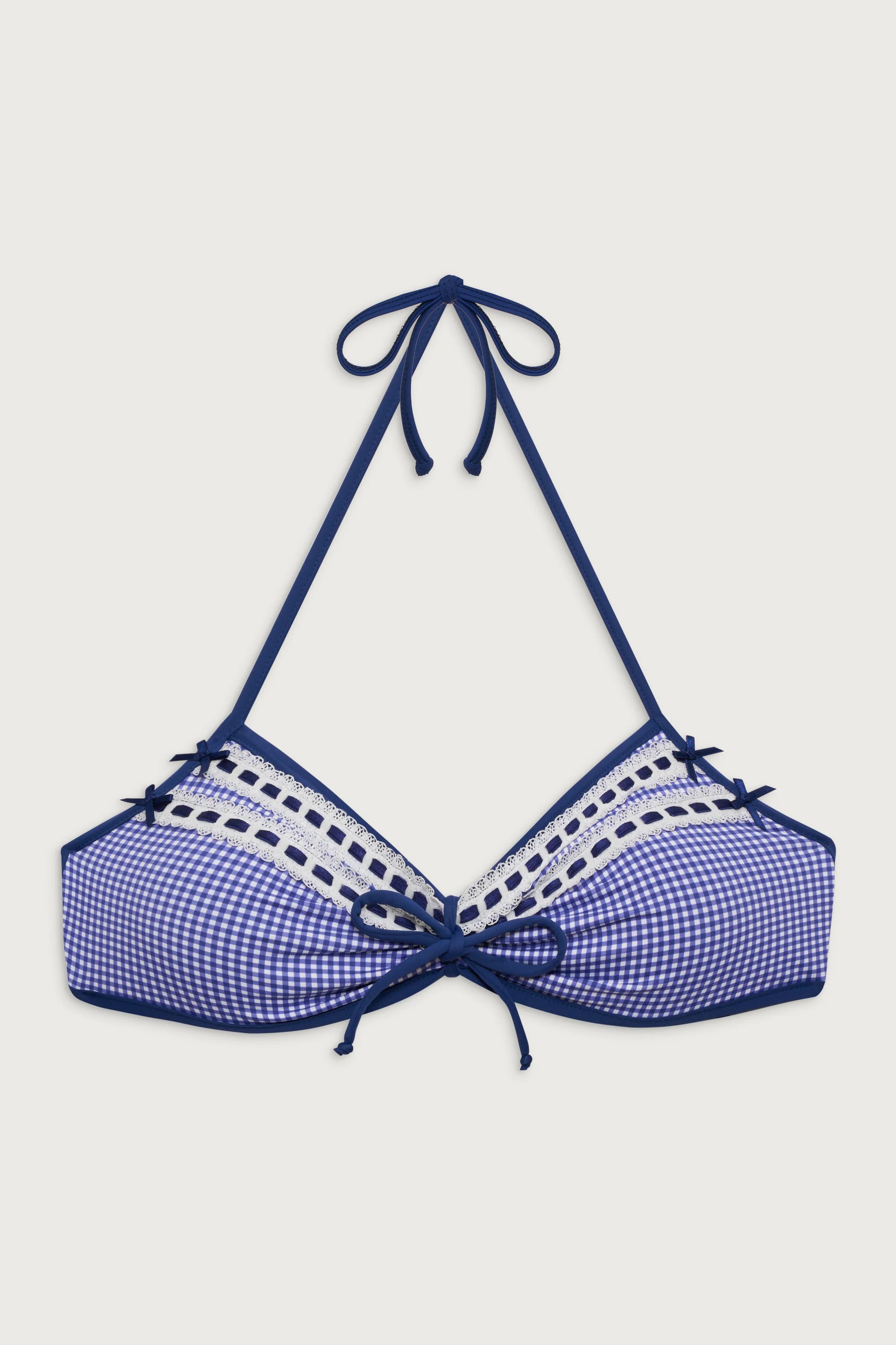 This may just be our most feminine triangle top. Meet the Jessup bikini top, designed with lace through trim, bow details, and adjustable halter neck and back straps. For a sweet spring set, pair the Jessup bikini top with any matching bikini bottom in Sailor Gingham