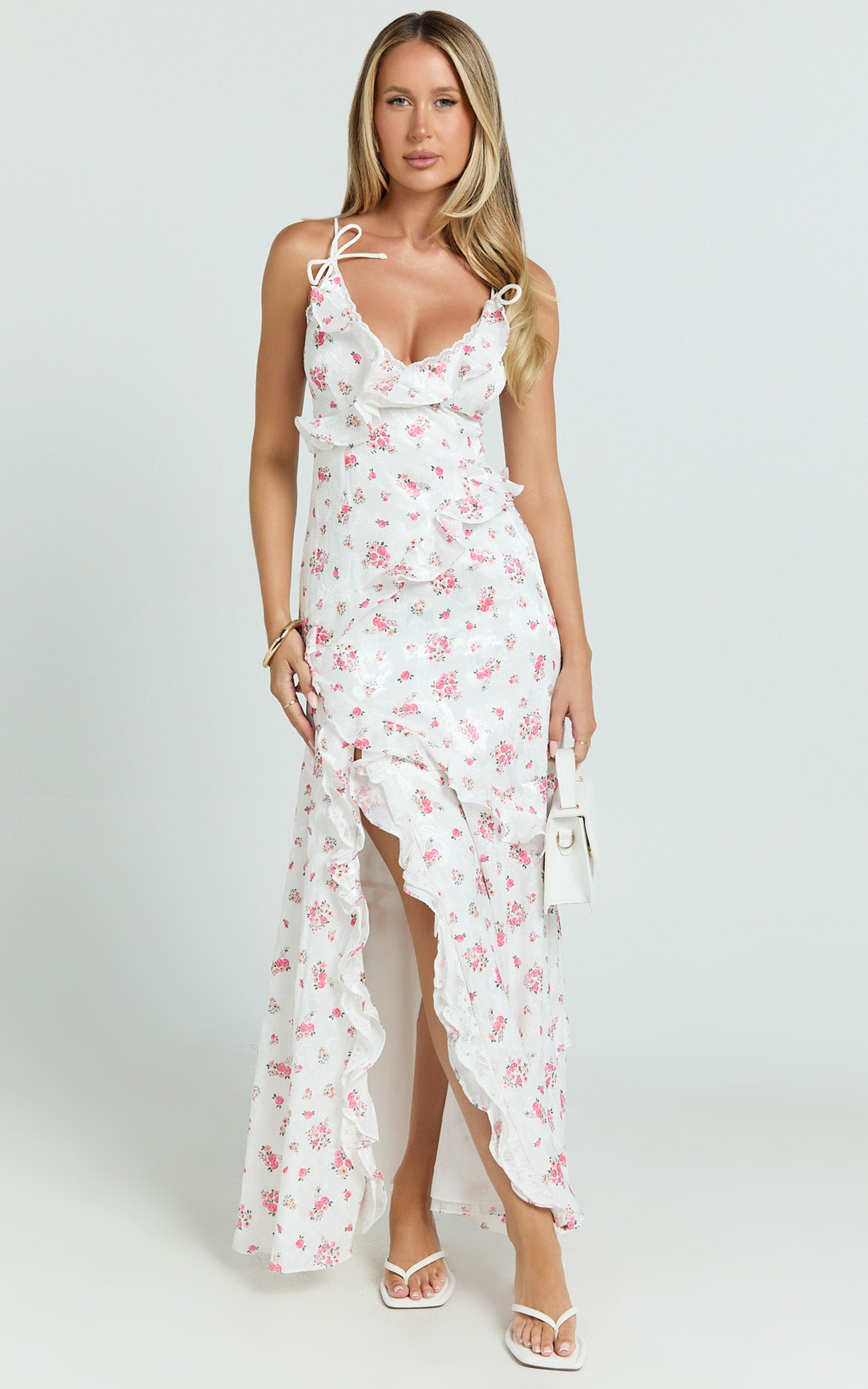 Transform your look with the Justine Maxi Dress, a stunning piece that encapsulates elegance in every detail. Crafted with a romantic ditsy print on a cream backdrop, this Jacquard V Neck Tiered Lace Trim Dress is more than just a piece of clothing; it's an experience. Designed to empower and inspire, the Justine Maxi Dress embodies the essence of femininity and grace, making it a perfect choice for any occasion, from a radiant party day to memorable evenings under the stars.