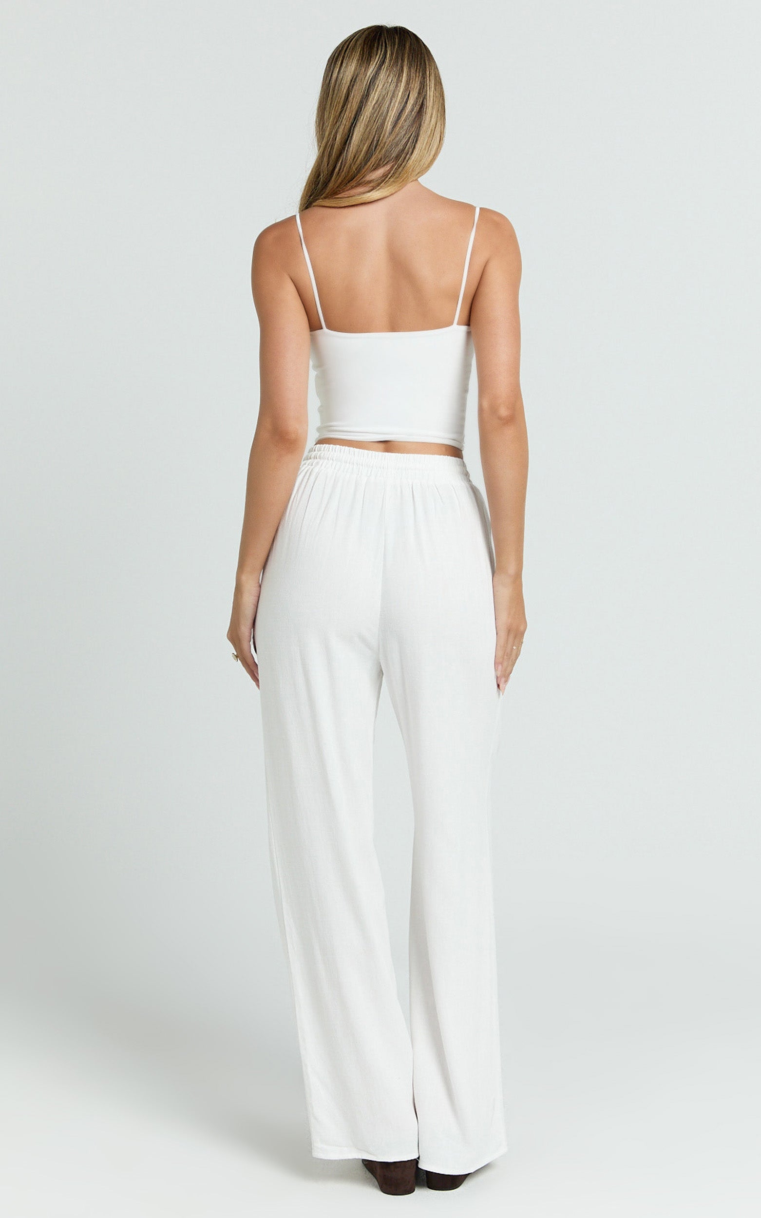 Crafted in crisp white with a comfy mid-waist elastic fit, these pants deliver laid-back elegance, ideal for mastering a minimalist look or stepping up your street-style game. Ultra versatile and always on-trend, they perfectly complement cropped tops, oversized blazers, or chunky sneakers, giving you a look that's runway-ready.