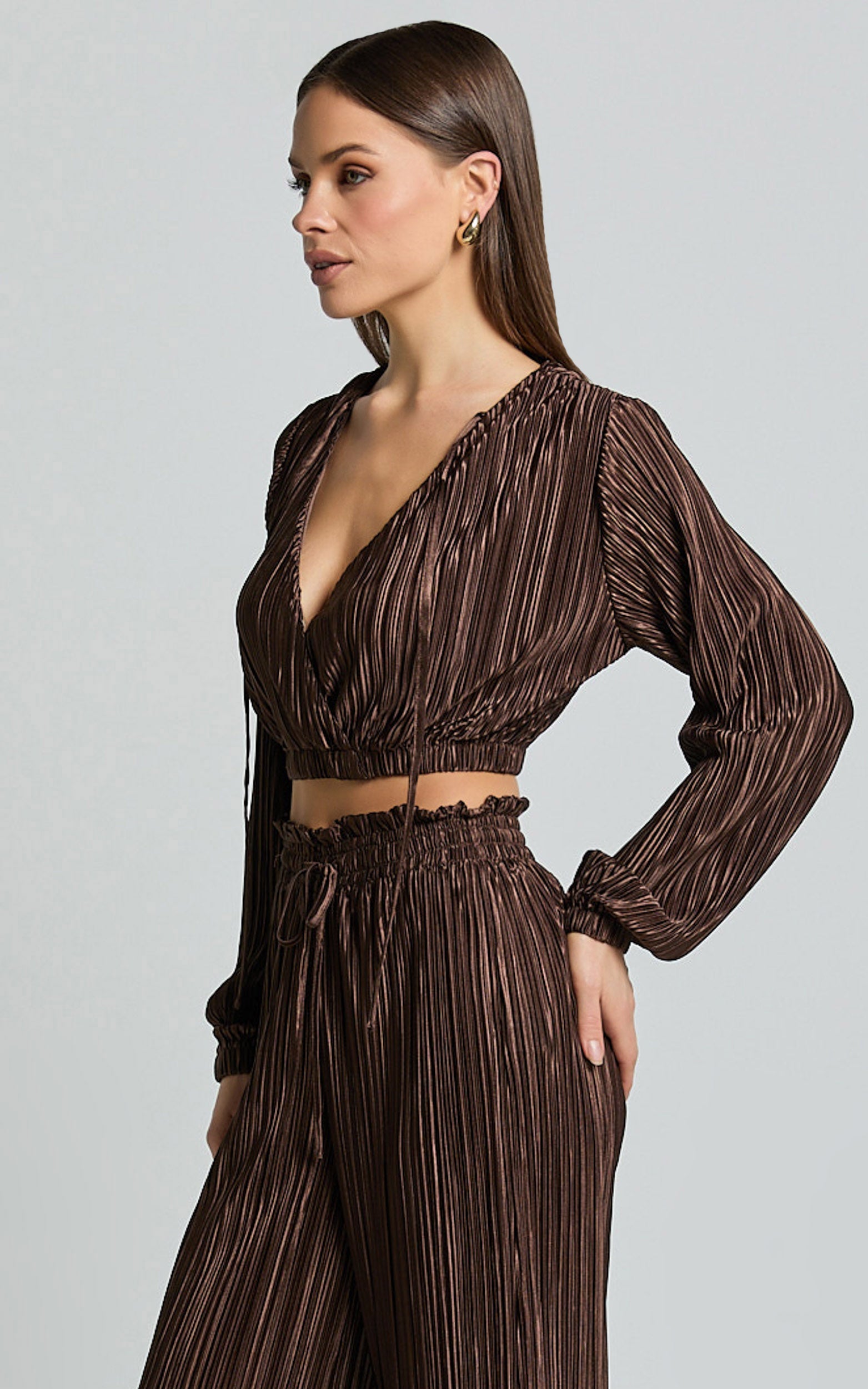 Embrace your individuality and make a statement with our Kallie Top - a masterpiece that defines both comfort and chic. This Tie Back Plisse Long Sleeve Crop Top in an alluring Chocolate hue is not just a piece of clothing; it's a celebration of your unique style and confidence.