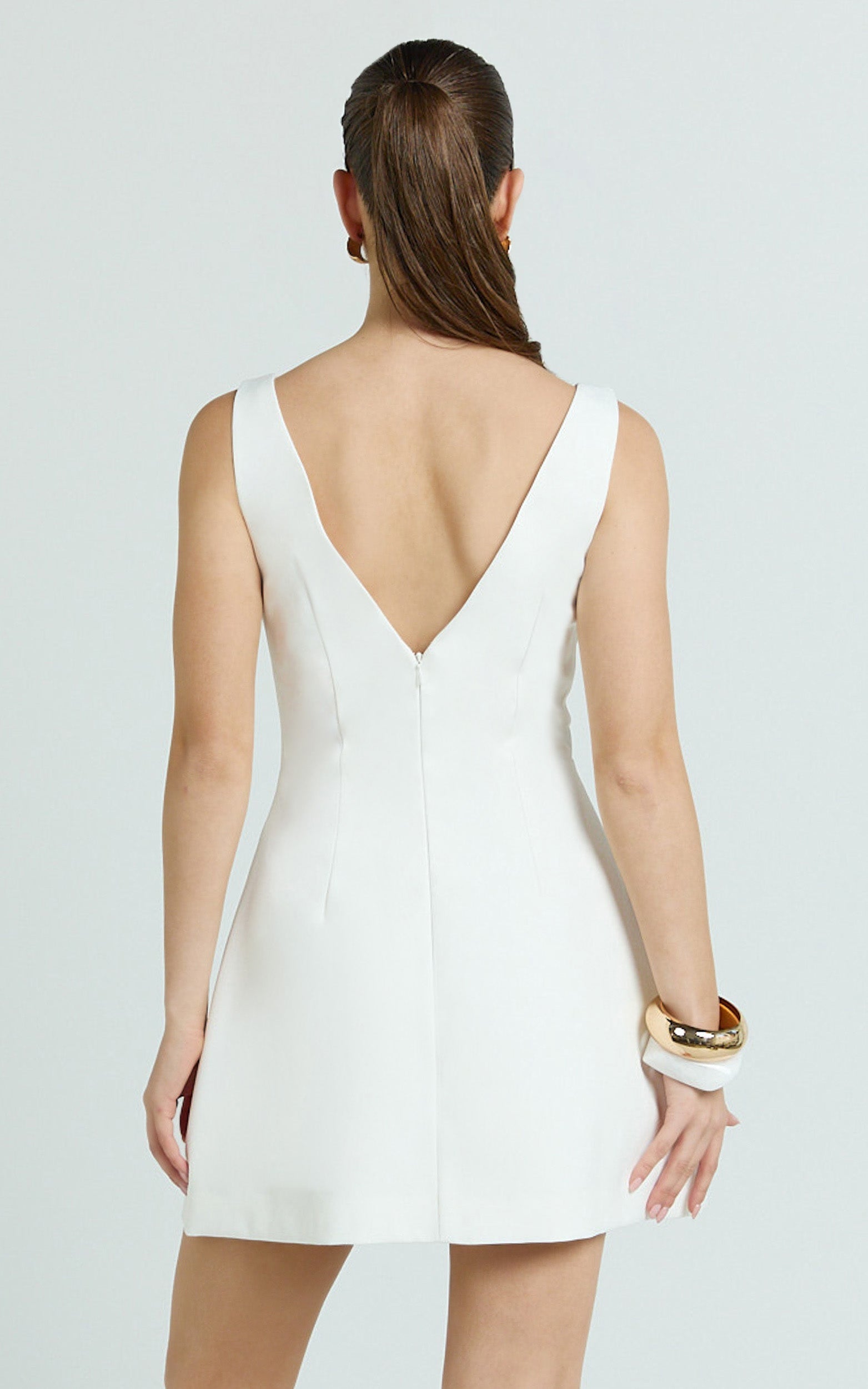 Karissa Mini Dress brings the flirt with a leg-lengthening hem and deep V that flatters from every angle. Lean into trending details with pendant necklaces for a little shine and balance the mini with oversized sunglasses for off-duty polish. Perfect for brides-to-be events, weekend parties and anything that calls for chic, effortless white.
