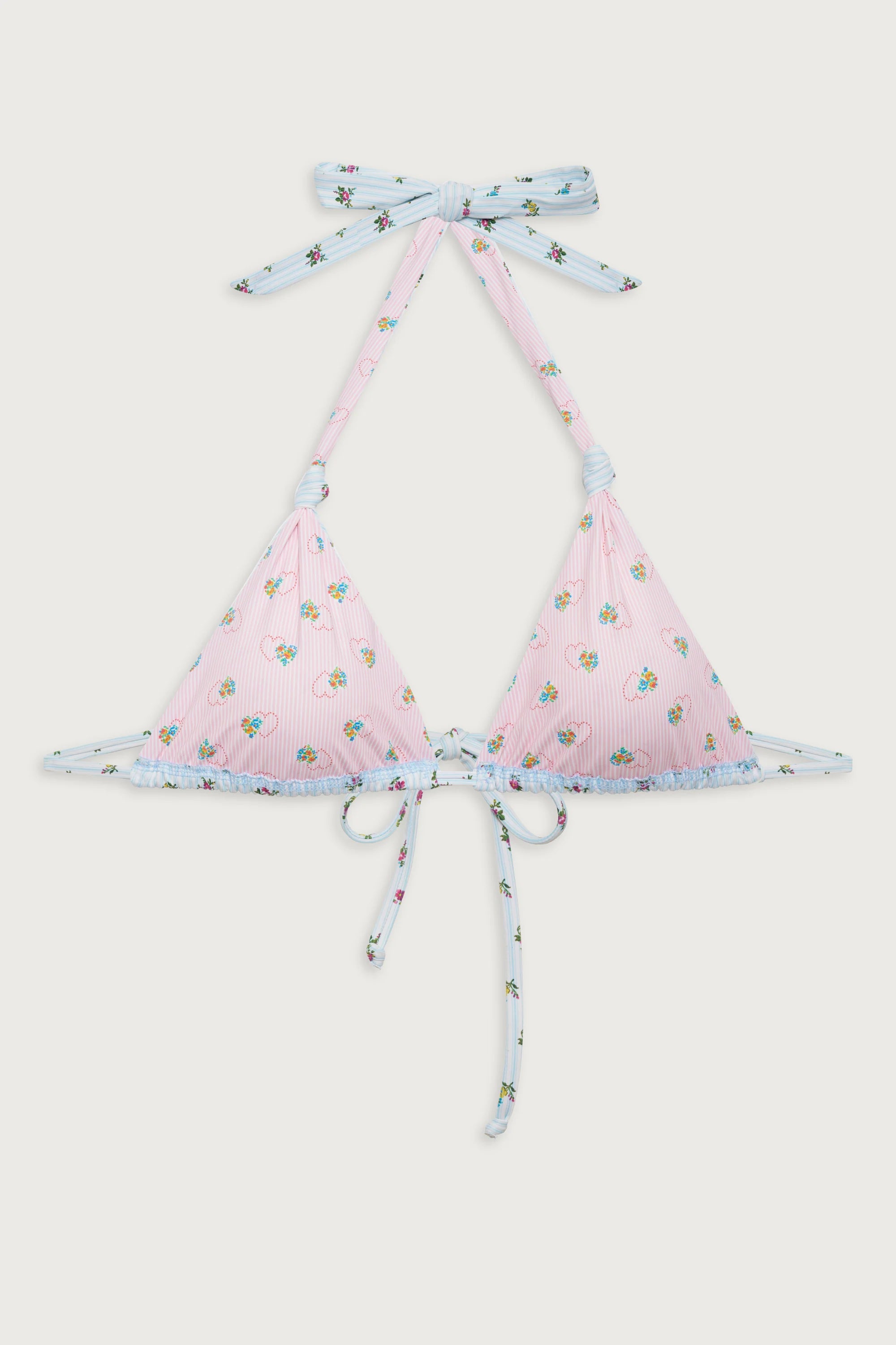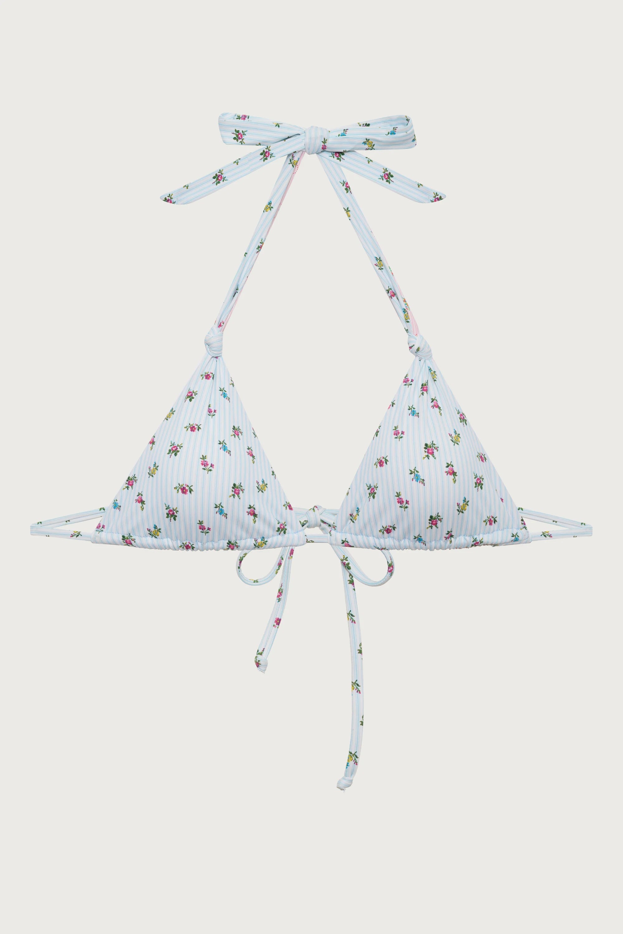 Introducing the Kealy triangle bikini top, an ode to early 2000s bombshell swimwear. The Kealy bikini top is designed in a fuller coverage fit with halter support, reversible functionality, and our latest floral Cozy Stripe print. Complete the set with the matching Kealy bikini bottom.