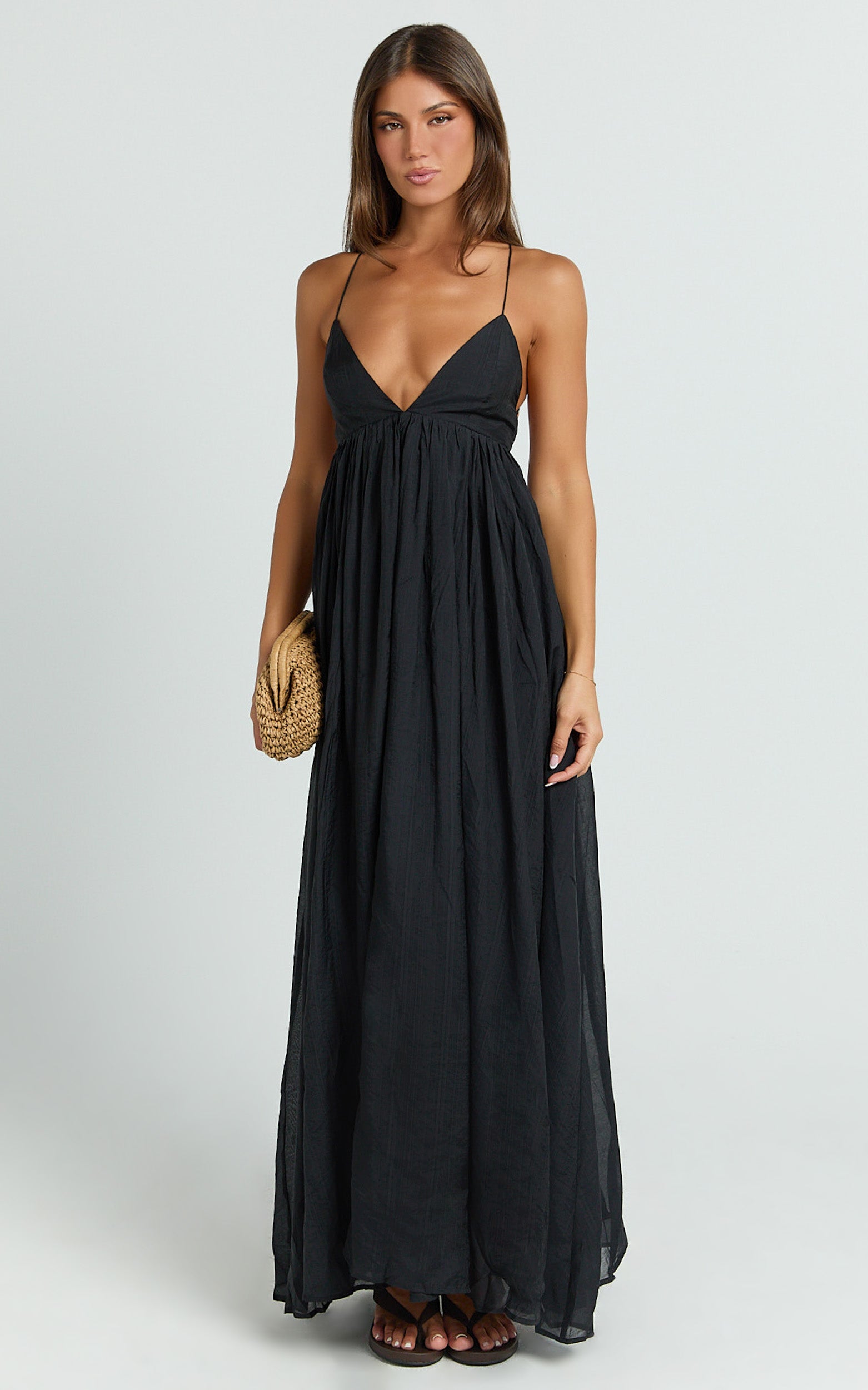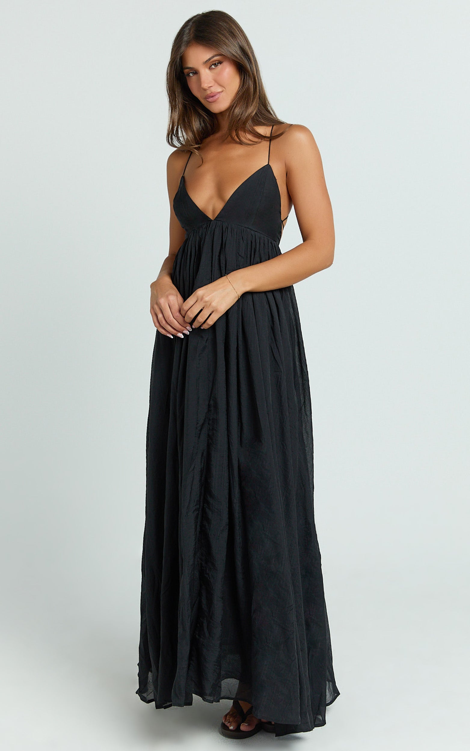 A curve-defining waist flows into a swishy maxi hem for that twirl-worthy moment, while the deep neckline is equal parts flirty and polished. Think Monochrome mood with a Minimalist silhouette, clean lines, zero fuss, maximum impact. Perfect for cocktail hour, weddings, and any RSVP where “wow” is the dress code.