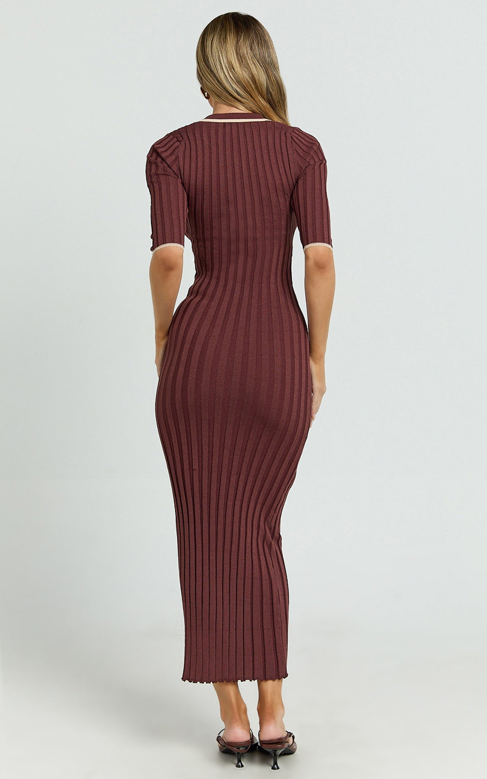 This short sleeve button front knit midi nails that minimalist energy with a body-skimming silhouette, flattering V-neck, and front button-through that lets you customise the vibe, polished for desk, a little undone for dinner. Rich brown tones keep it timeless while the clean lines feel effortlessly versatile for your Dresses rotation.