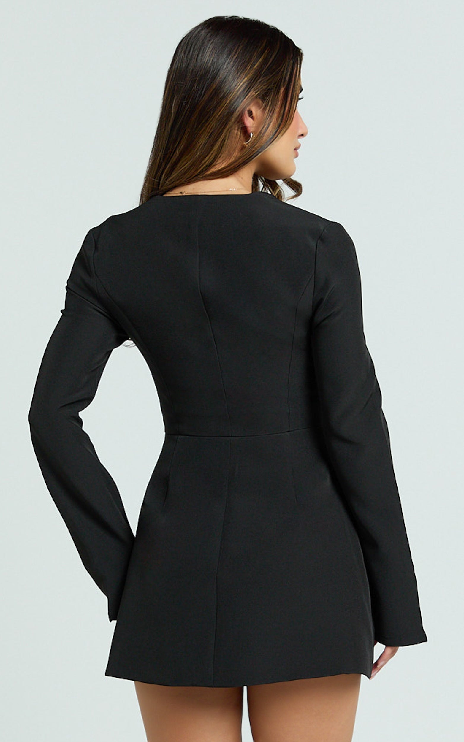 This long sleeve mini features a sweetheart neckline, zip-front detail and a tulip hem that frames your legs, sleek, confident and ready for the spotlight. The black hue leans Monochrome chic while the clean lines give it a Minimalist vibe, making it the ultimate throw-on-and-wow piece for nights out, date plans and last‑minute invites.