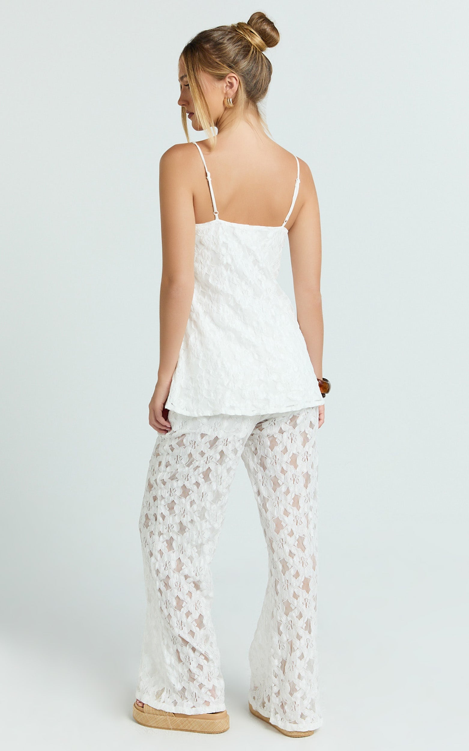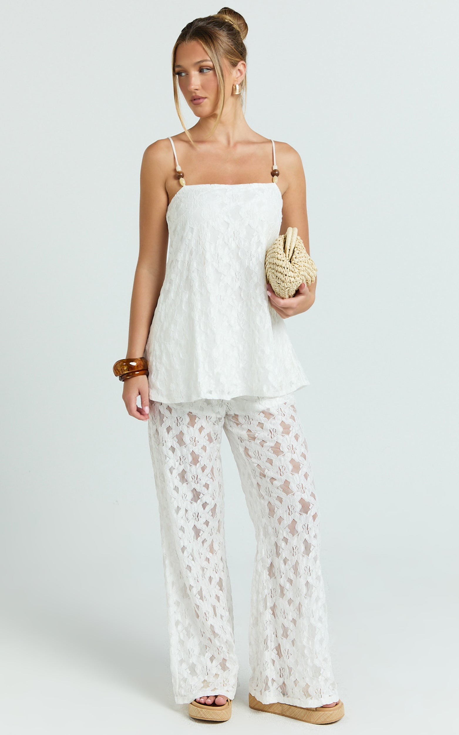 A beaded cami meets wide leg lace pants for an effortless co-ord moment in crisp white, clean, elevated, and made to flatter from every angle. The cami adds shimmer up top while the flow of the pant brings drama and ease, perfect for parties, long lunches and everywhere you want that confident glow.