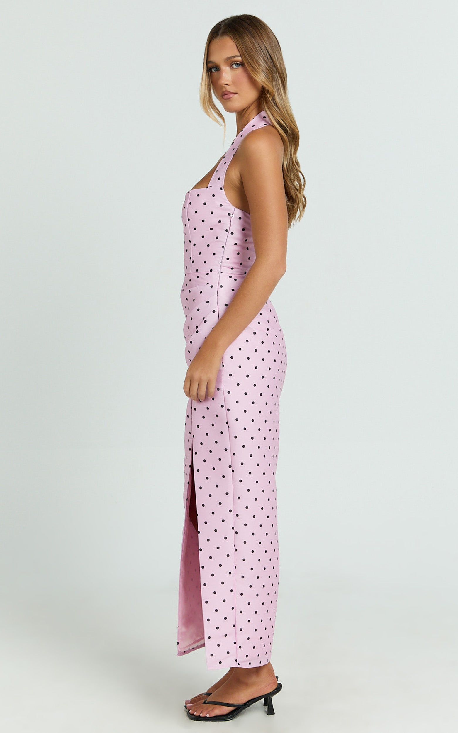 This pink halter midi serves a flattering V neckline, tucked waist detail and a sleek side leg split for leg-lengthening drama. The fitted silhouette is chic yet effortless, nailing that elevated look from cocktails to wedding guest moments.