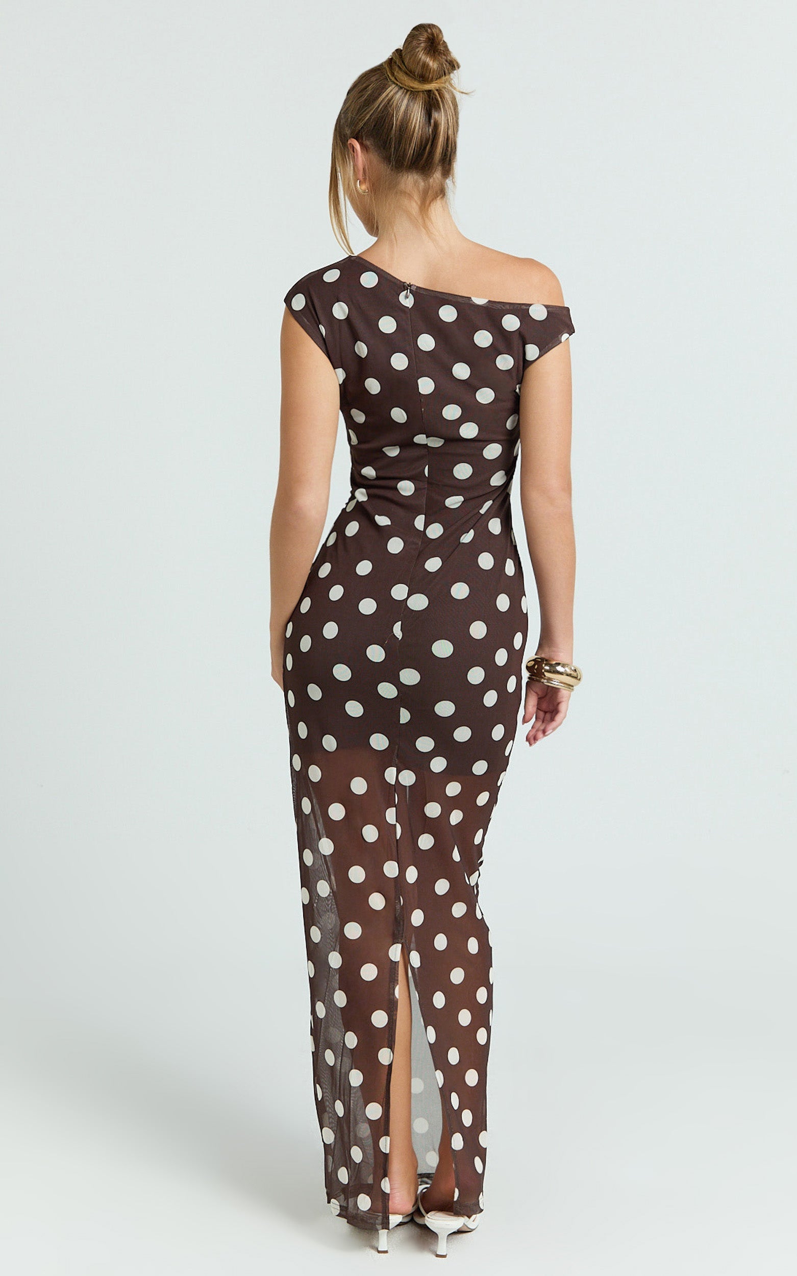 A fitted bodice skims the waist before falling into a fluid maxi hem, while the white spot print keeps it playful yet polished. Think date nights, wedding guest looks, or long lunches, she’s versatile, flattering, and made to move.
