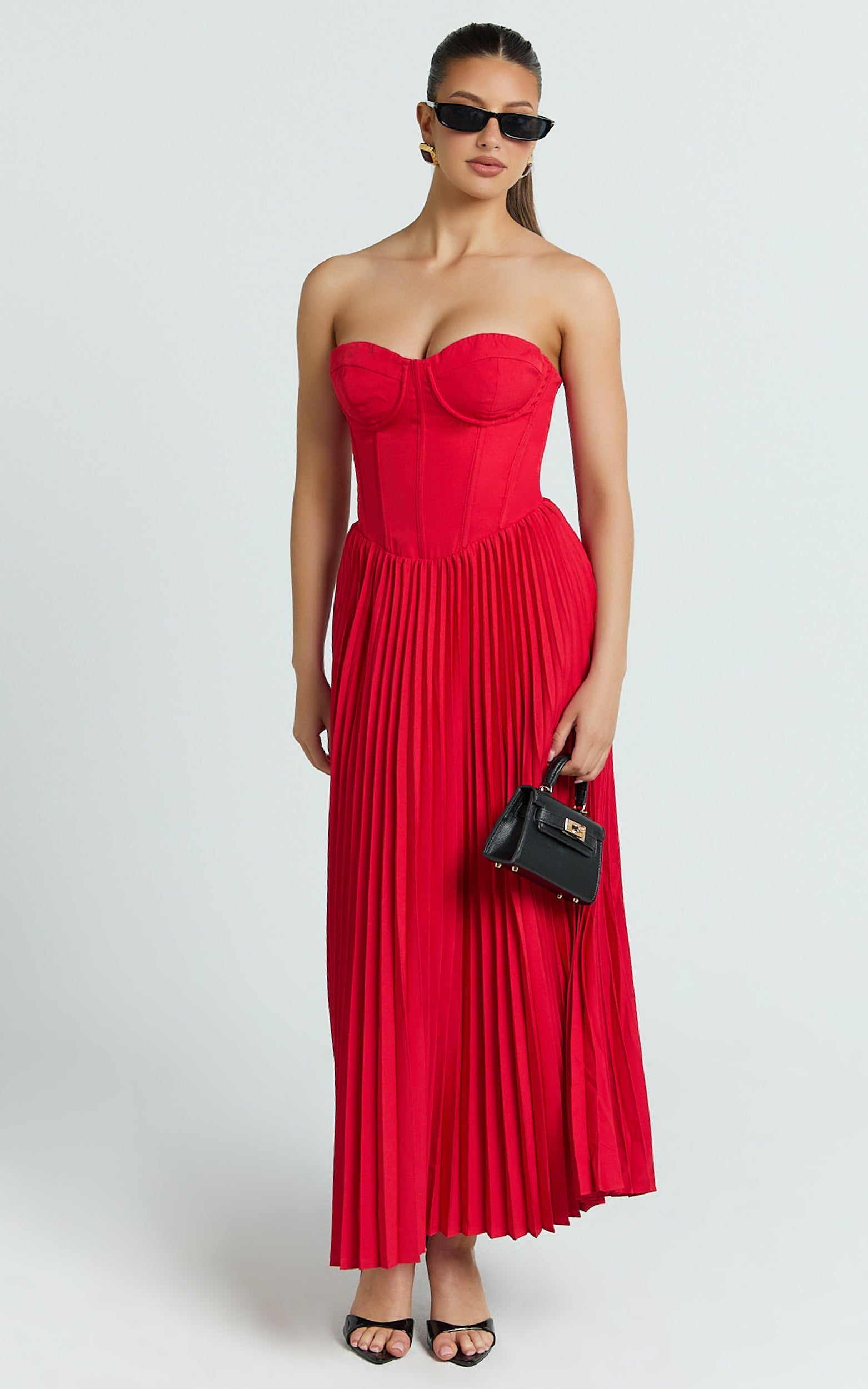 Loretta Midi Dress - Lace Up Back Bustier Pleated Dress In Red brings sculpted support up top and a flowy, twirl-ready skirt below, hello legs-for-days. Style with minimalist heels and statement accessories for a sleek finish, or dial it up with a glossy lip and a clutch. This is one of those Dresses that makes getting ready feel like the main event.