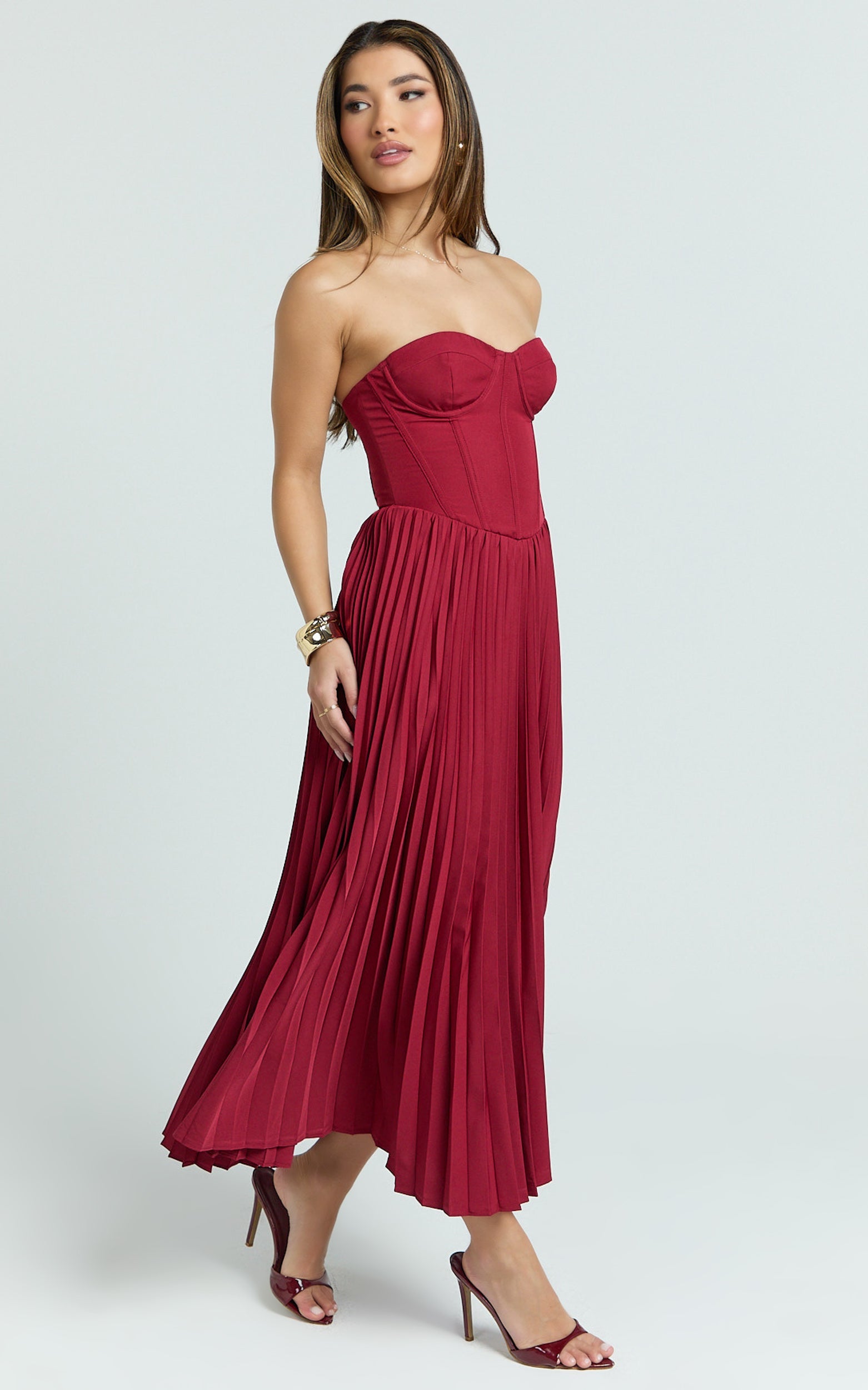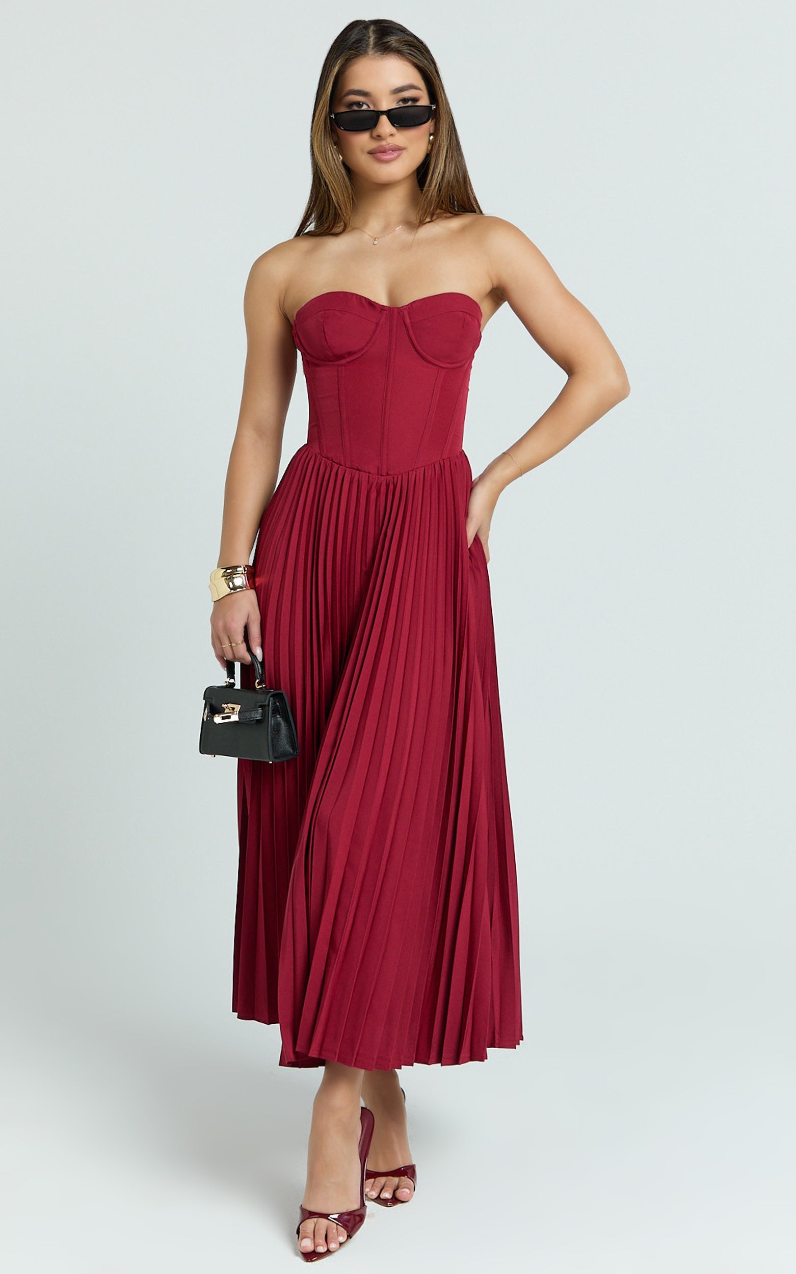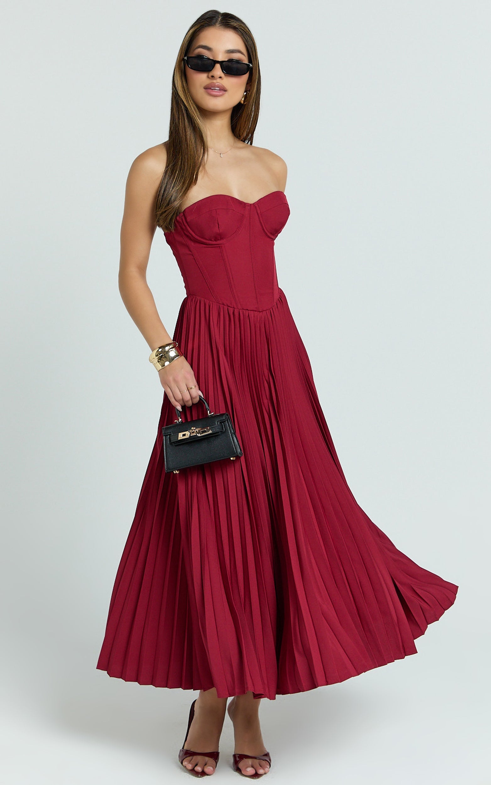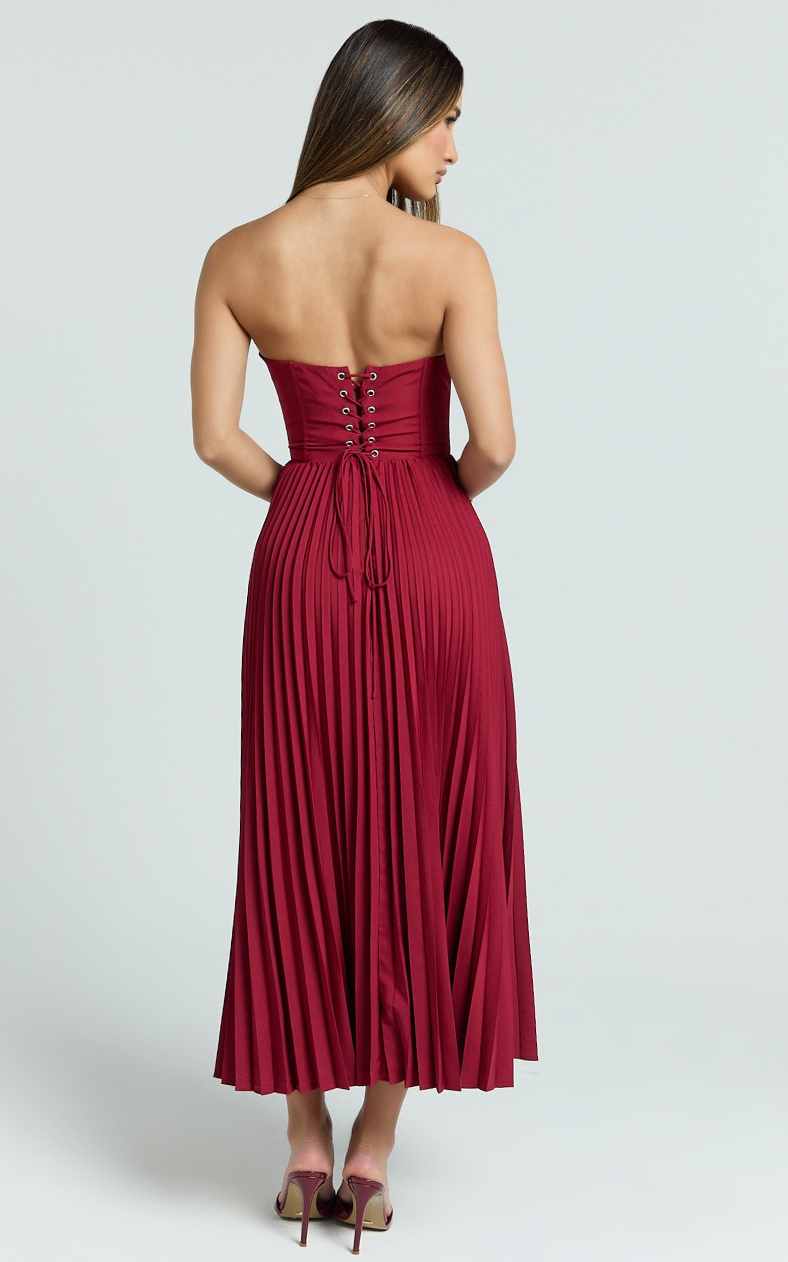 With a sleek midi length and romantic lace-up detailing, the Loretta Midi Dress - Lace Up Back Bustier Pleated Dress In Wine balances sultry and sophisticated so you can twirl, toast, and take the spotlight. Pair with minimalist heels and a delicate clutch to let the rich hue do the talking. This is one of those Dresses you’ll reach for when you want compliments on repeat.