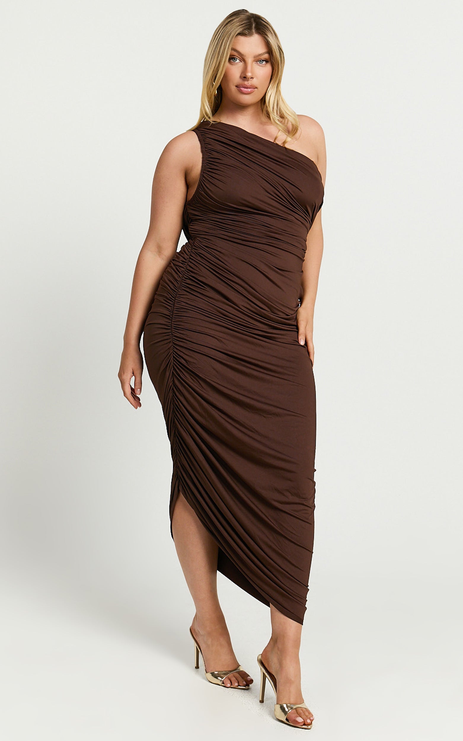 Designed in a rich chocolate hue, this one-shoulder beauty gives you runway-worthy style with figure-flattering ruched detailing and a chic, minimalist silhouette. From elegant evening soirées to cocktail-hour showstoppers, this timeless midi dress will keep you looking effortlessly stunning with just the right touch of sultry charm.
