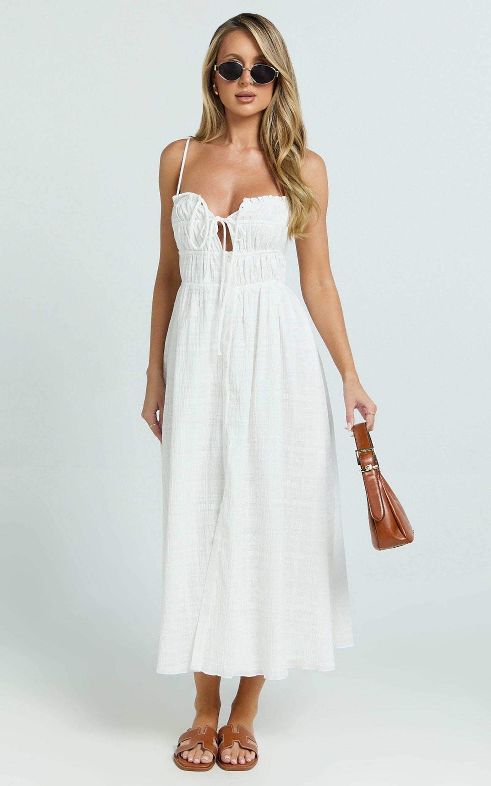 Featuring ruched detailing down the button-up front, a flattering V-neckline, and a sleek midi-length silhouette, this white beauty is exactly what your wardrobe has been missing.