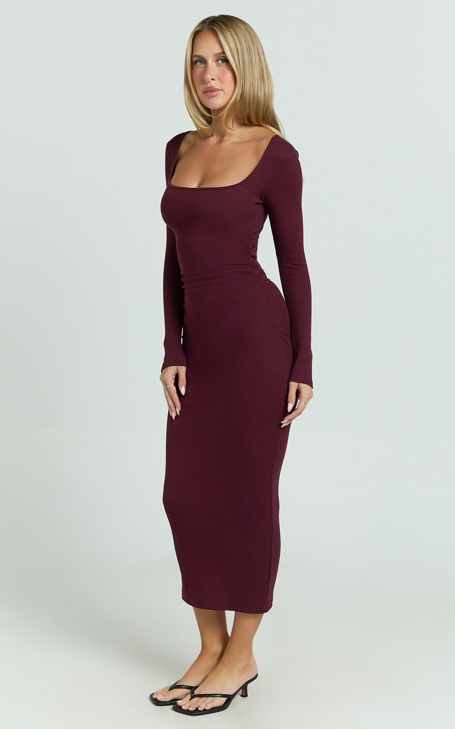 Meet the Lucy Midi Dress - Ribbed Side Ruched Bodycon Dress In Wine: a Versatile, Vintage-inspired take on the classic party piece. The adjustable drawstring lets you customise the length, while the sleek scoop neckline keeps it clean and elevated. Add strappy heels and a mini shoulder bag to complete the look and you’re done.