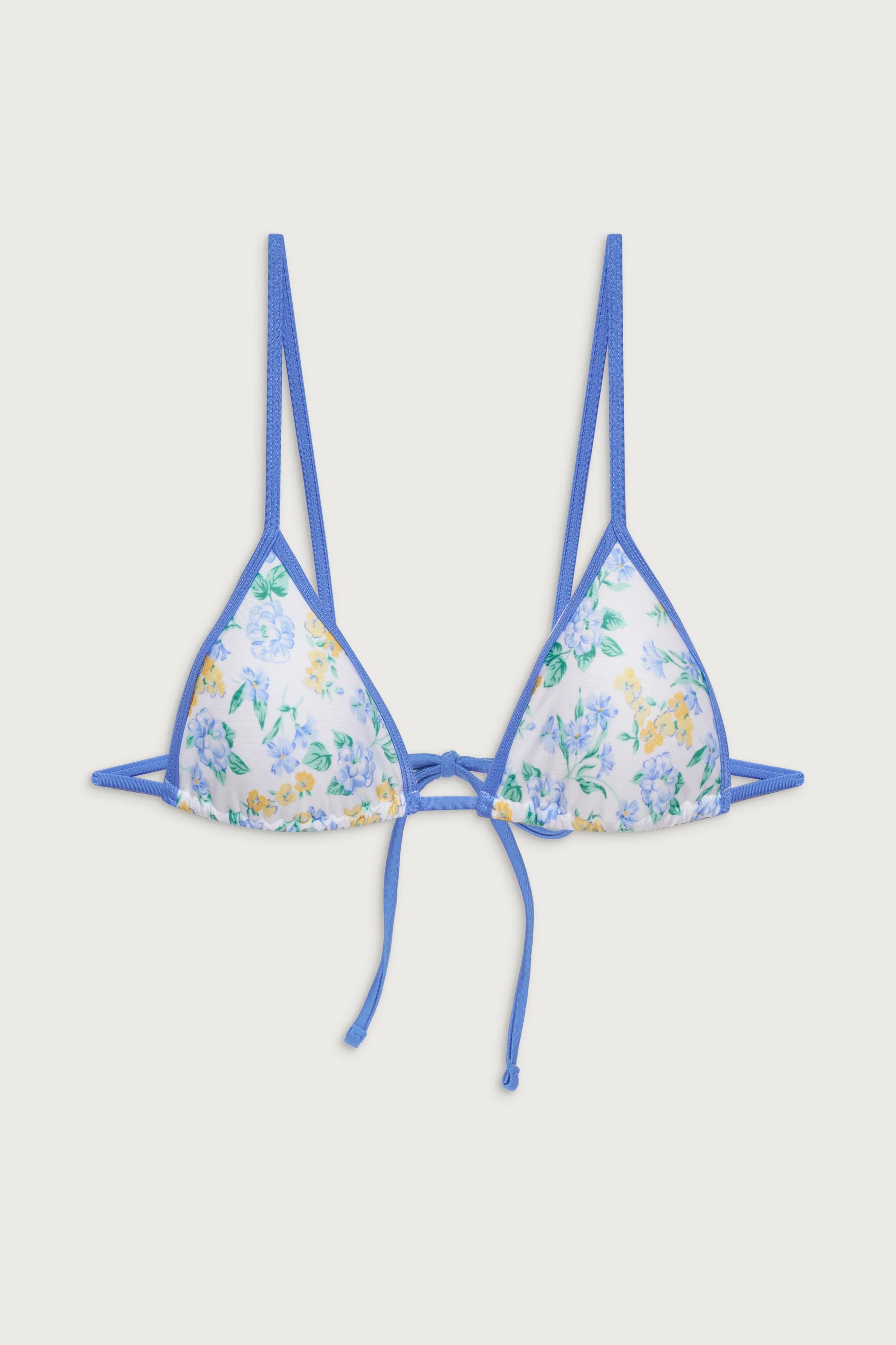 Meet the Lumia bralette-style bikini top, a classic addition to your swimwear collection. This skimpy triangle shape features blue binding and adjustable over-the-shoulder ties, ensuring a customizable and comfortable fit. Designed with our signature shine fabric, the Lumia floral bikini top will add a glisteing layer to your beachside ensemble.