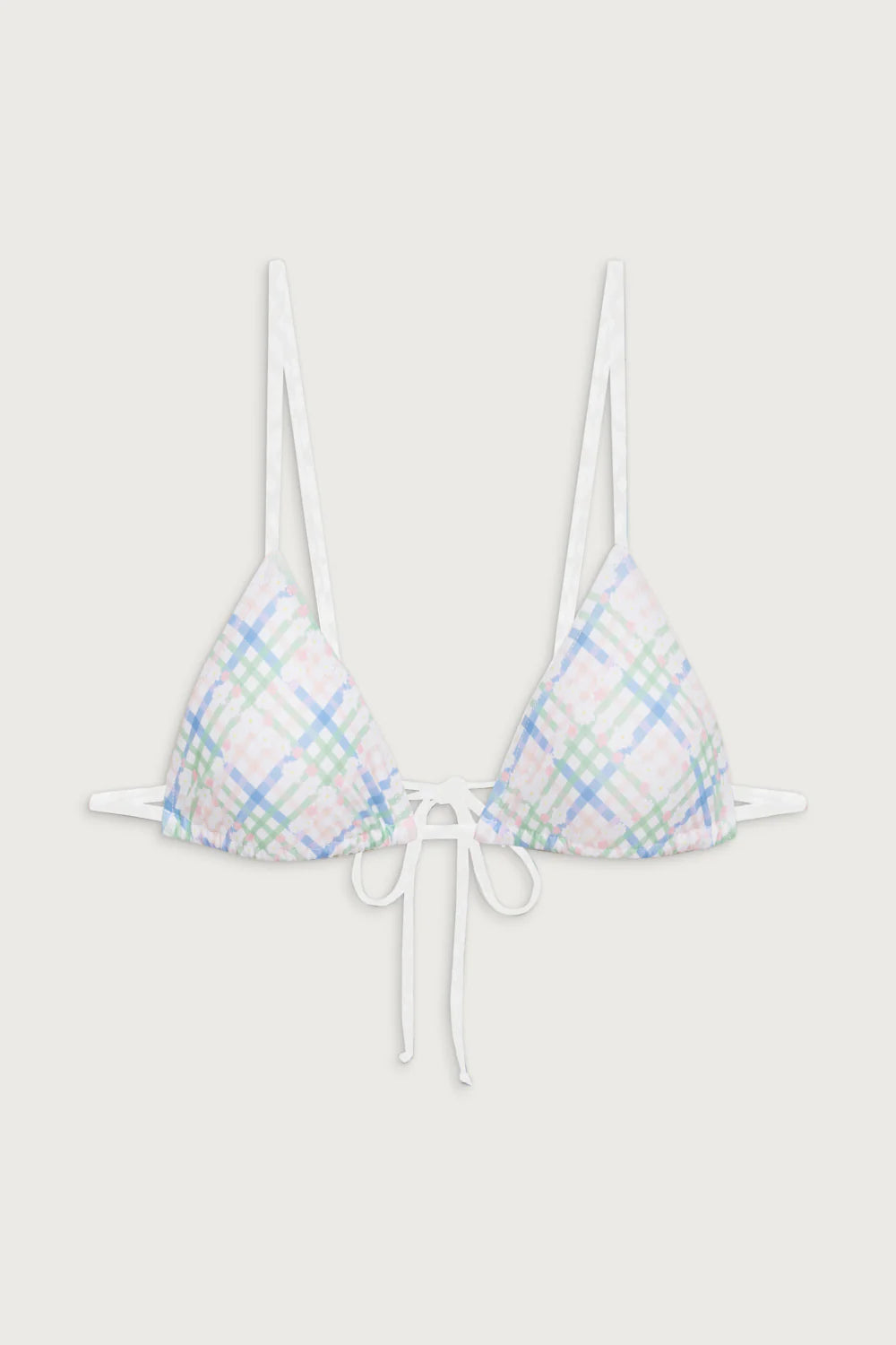 A skimpy addition to your swimwear collection, the Lumia triangle bikini top features an eye-catching pastel plaid print and adjustable over-the-shoulder straps, ensuring a customizable and comfortable fit.