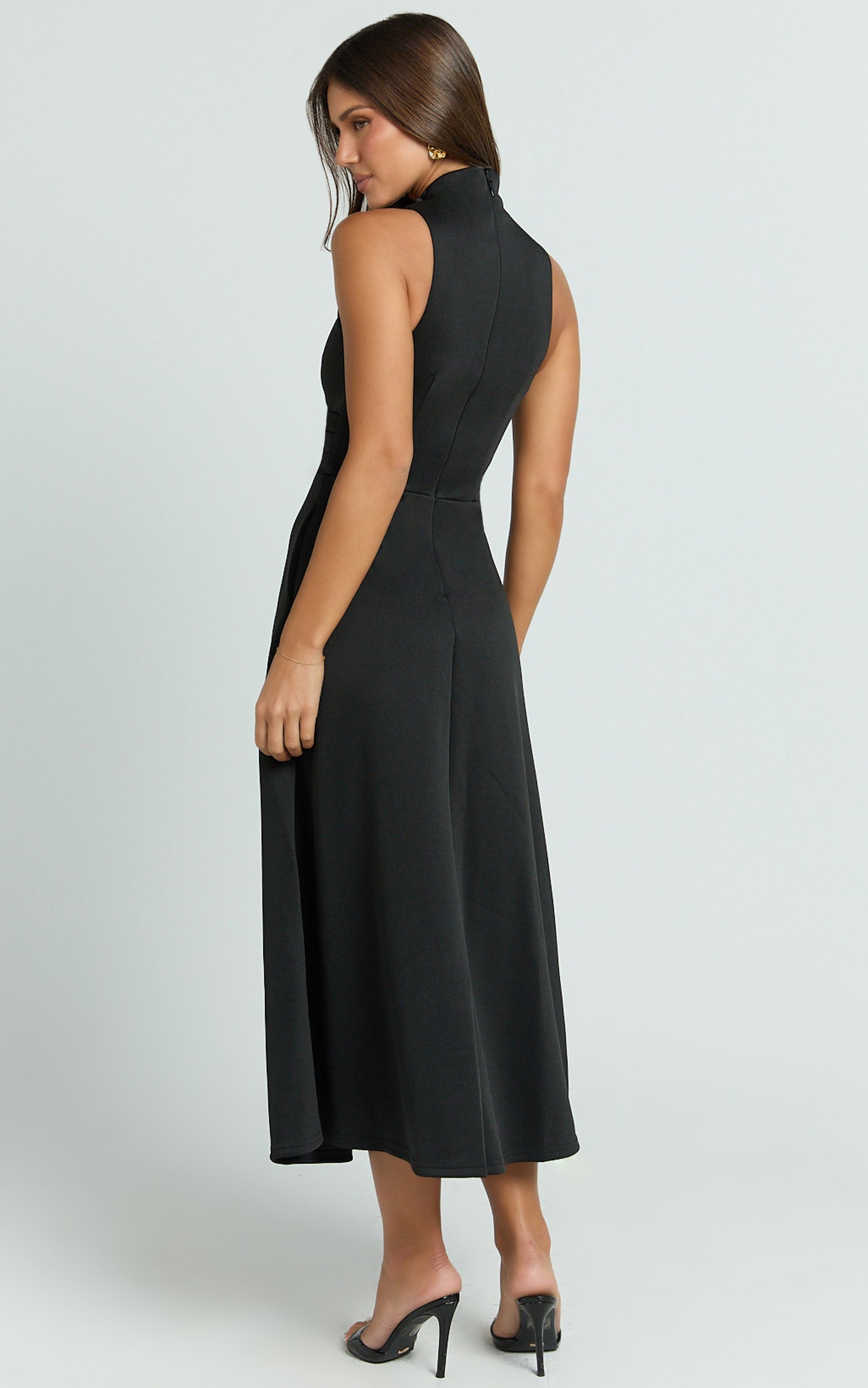 This high neck A-line silhouette sculpts the waist and skims the hips for a polished midi moment that works desk to dinner and every RSVP in between. Clean lines, a sleek fit, and that swishy hem bring instant confidence, style it with pendant necklaces for a little glow and tap into sheer statements with a barely-there layer if you’re feeling bold.