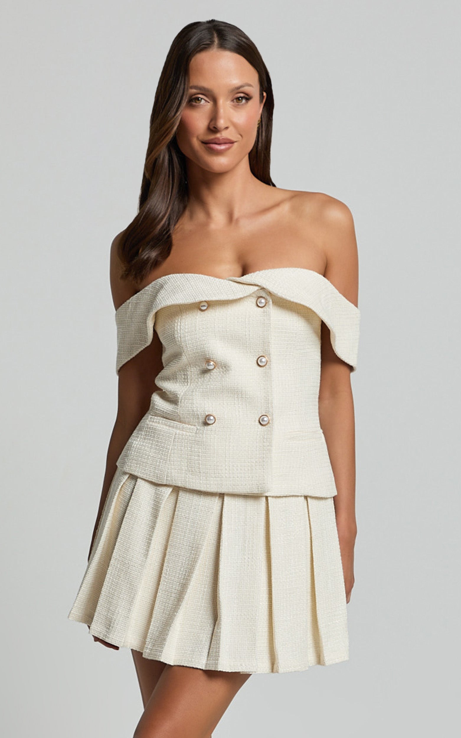 Transform your look with the Maggie Mini Skirt - your new go-to for turning heads and stepping up your style game! This pleated, mid-rise boucle skirt in a chic cream hue is the epitome of fun meets fashion. Crafted from high-quality polyester, it's not just about looking good (which you absolutely will), but also about feeling comfortable all day or all night long.