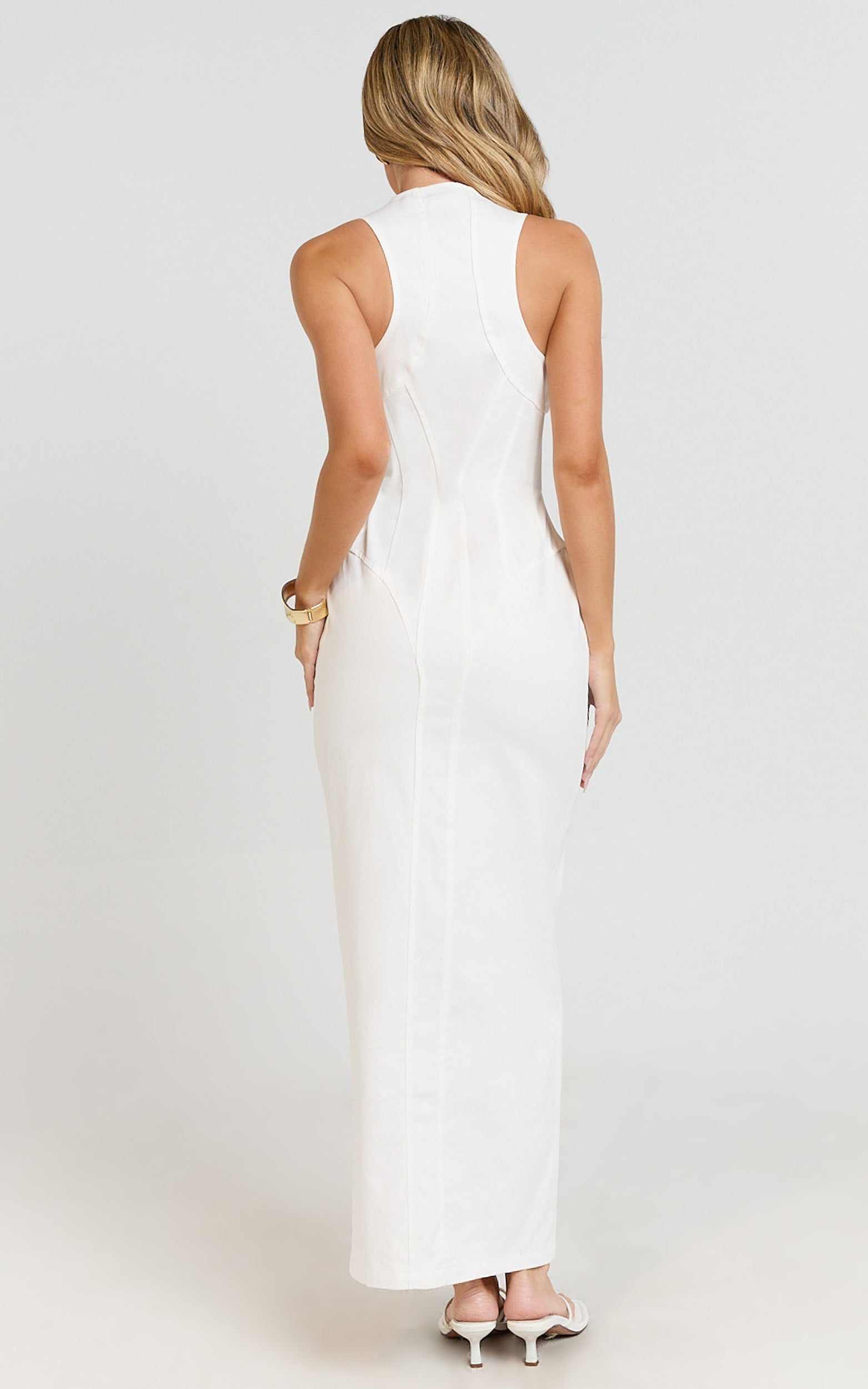 This scoop neck racer back maxi hugs in all the right places and goes from day plans to after-dark with zero effort. A white Dresses moment that taps into Quiet Luxury, it’s the minimalist base your wardrobe’s been waiting for, body-skimming, elongating, and seriously photogenic.