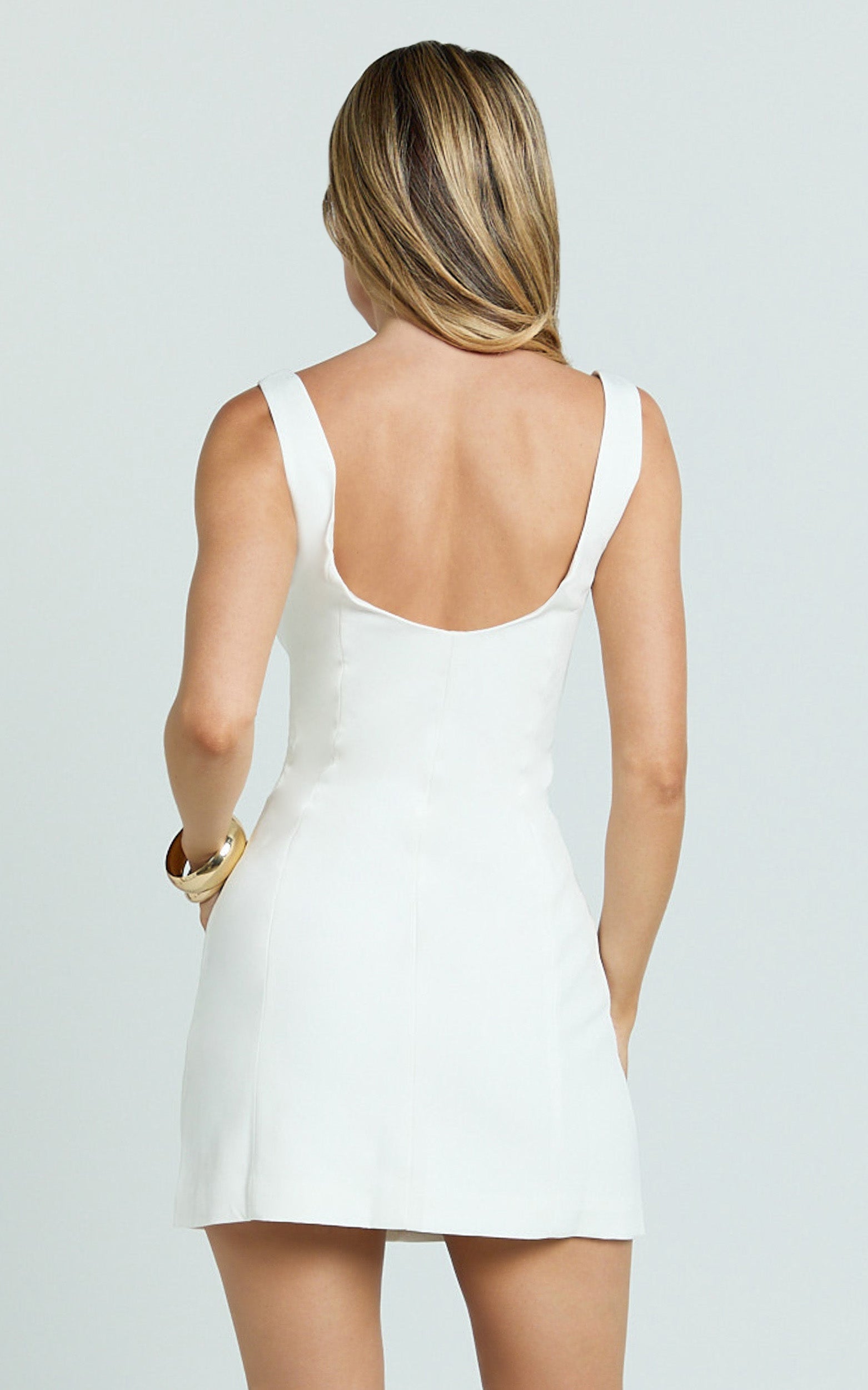 This fitted mini brings a scoop neckline and hook-and-eye front that snatches the bodice and frames your decolletage, sleek, flirty, and party-ready. Think polished minimalism with a dash of Naked dressing energy, letting that clean silhouette do the talking while you serve legs for days.