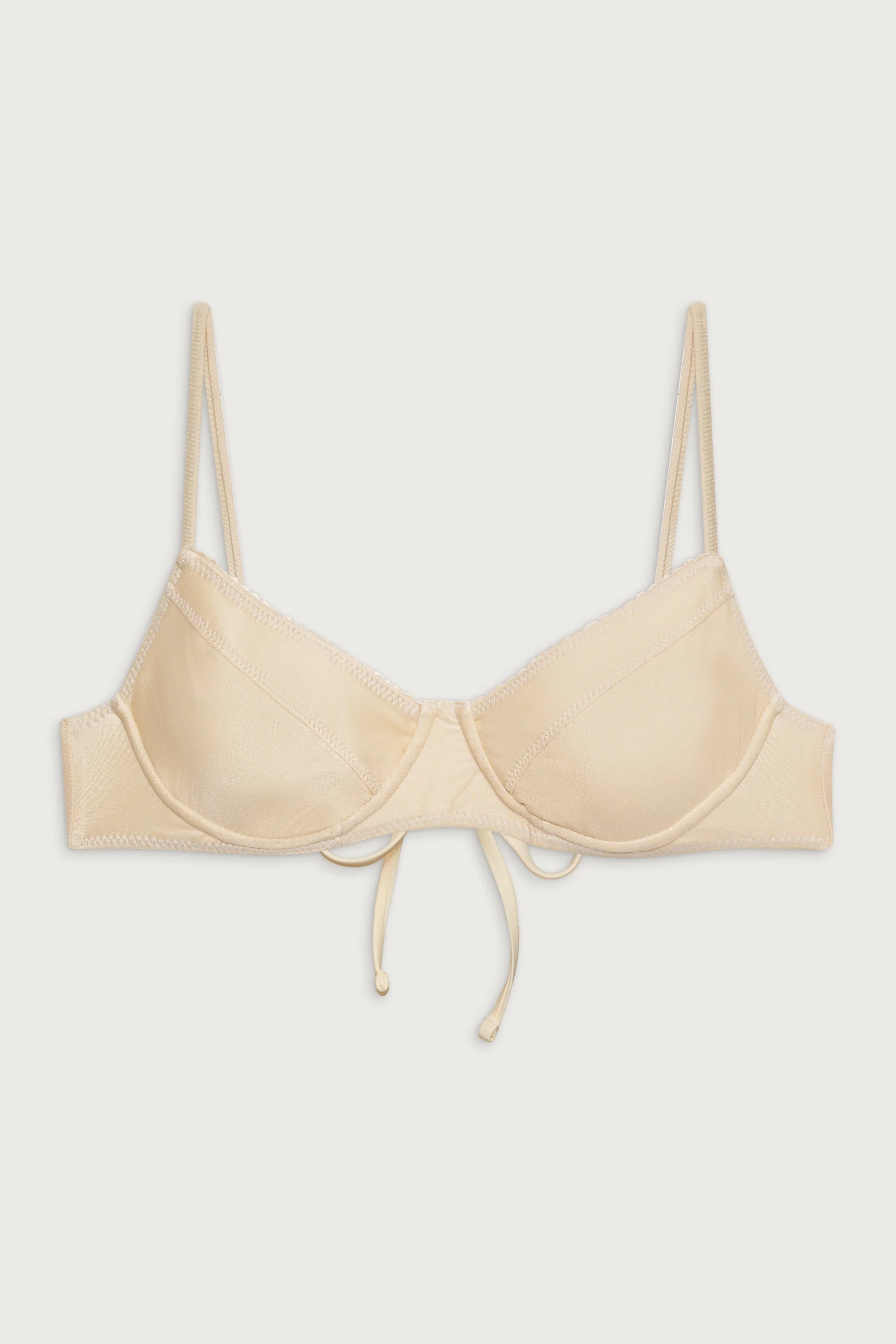 Embrace the start of summer with the Matilda bikini top. This bikini top features glistening shine fabric and our newest neutral, Sand Castle. Matilda is crafted with underwire support, medium coverage, adjustable shoulder straps, and a tie-back design to ensure a perfect fit.