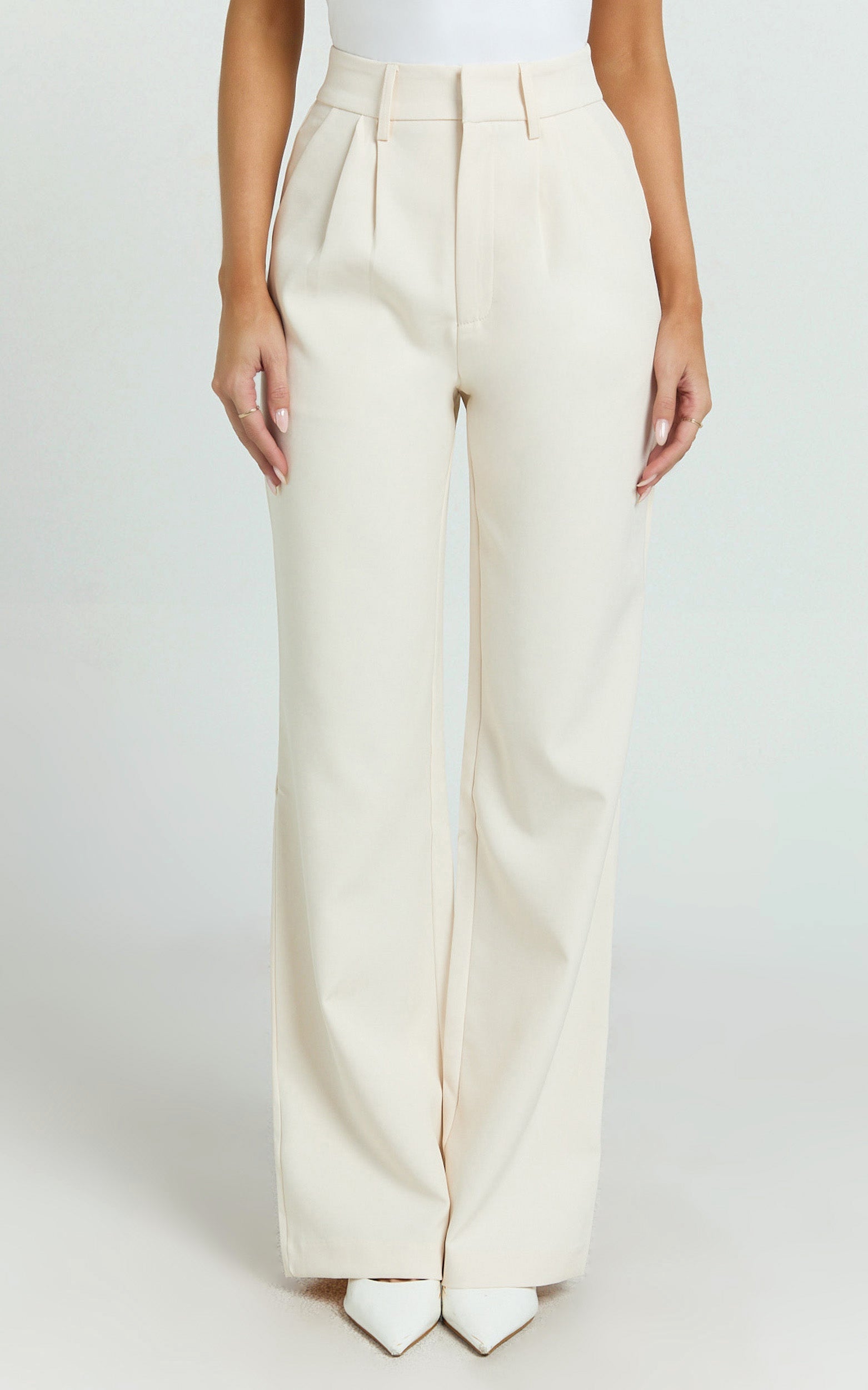 These pleat-front wide leg Pants in cream nail that Quiet Luxury vibe, tailored, elongating, and effortlessly chic from desk to drinks. The high-rise fit and fluid drape serve polished proportions, while the clean cream hue plays well with everything from tonal knits to a sharp blazer for that elevated, pulled-together moment.