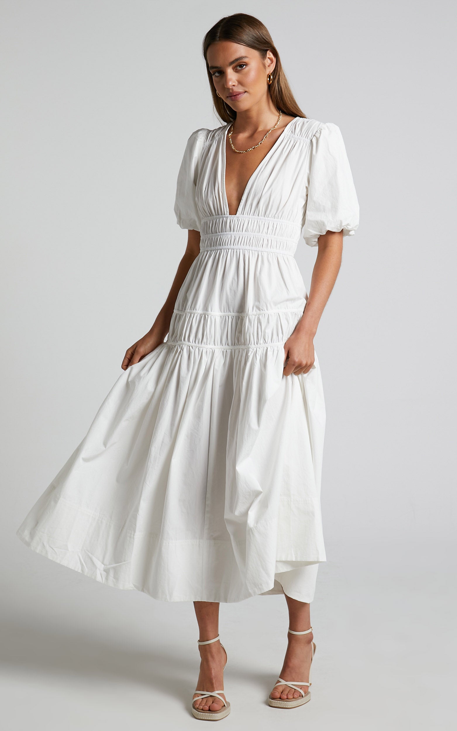 Introducing our Mellie Midi Dress, the perfect one-and-done summer outfit! Made with puff sleeves, a plunge neck and elastic trims with ruching, it will suit a range of moods and occasions right through the warmer months. Wear it with heels and a chunky chain necklace for a polished party look!