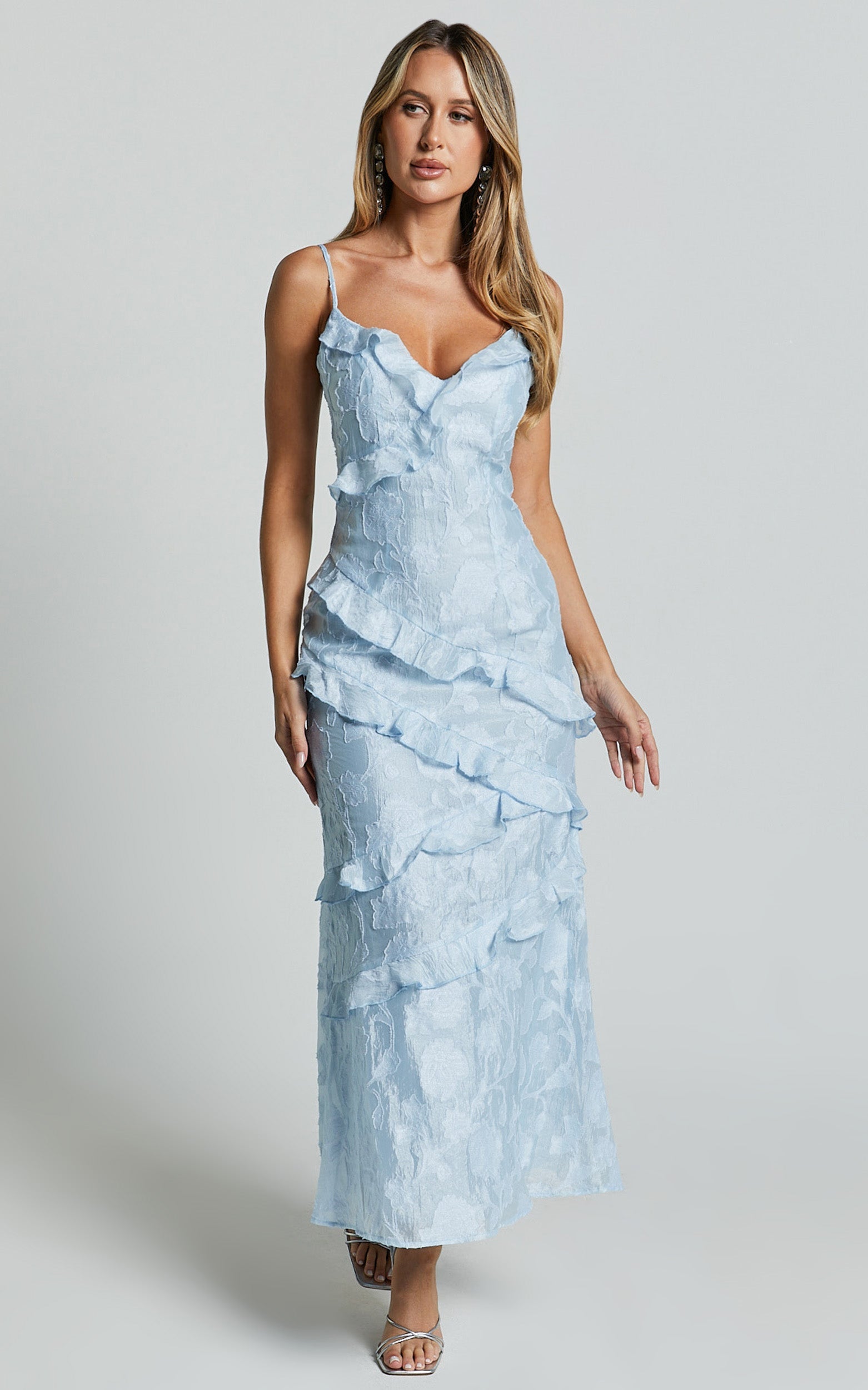 The Michaela Midi Dress in Light Blue brings dreamy movement with its tiered skirt and soft ruffle detailing, while the jacquard finish adds a luxe texture that feels special from brunch to balcony nights. The elongated silhouette flatters and lengthens the frame, keeping you confident and camera-ready wherever you go. Style the Michaela with minimalist sandals for a clean daytime look, or elevate it with metallic earrings and a chic clutch for twilight events. Effortless, romantic, and made to turn heads, she’s your new go-to for garden parties, celebrations, and everything in between.