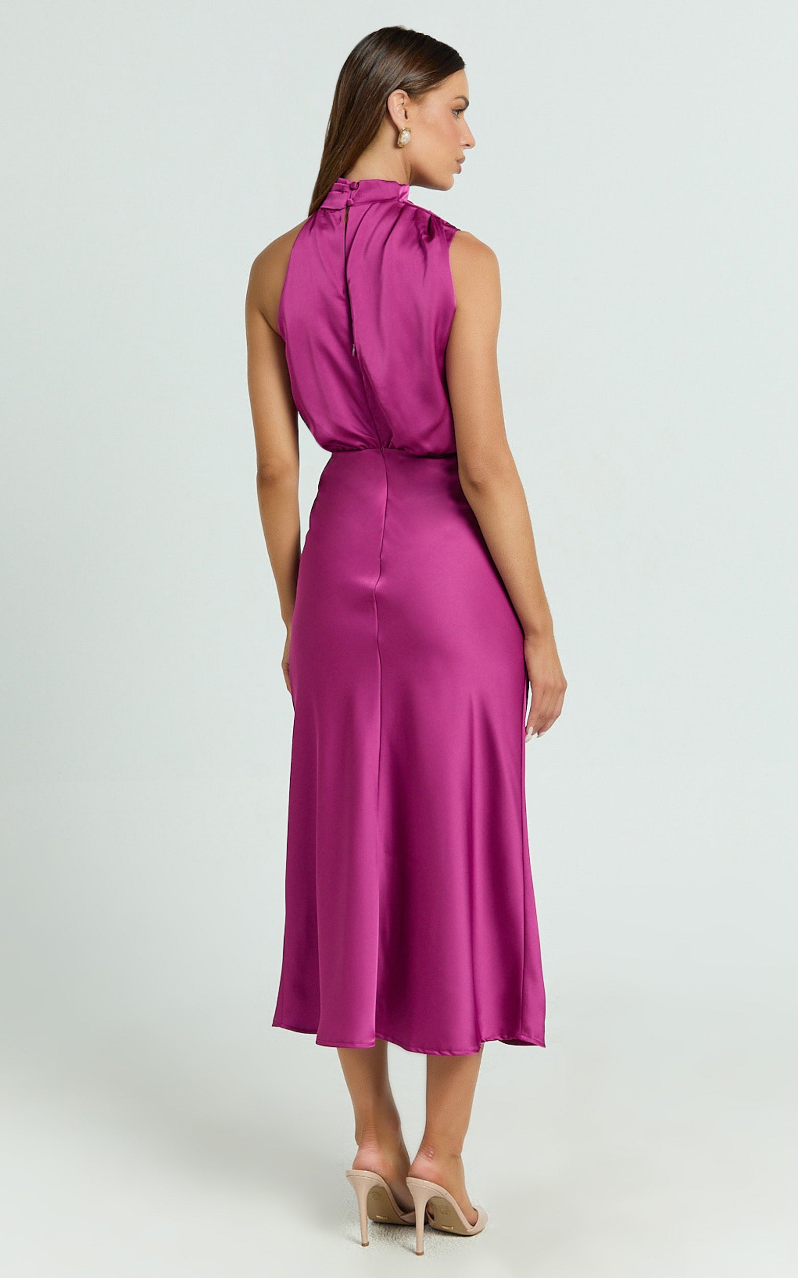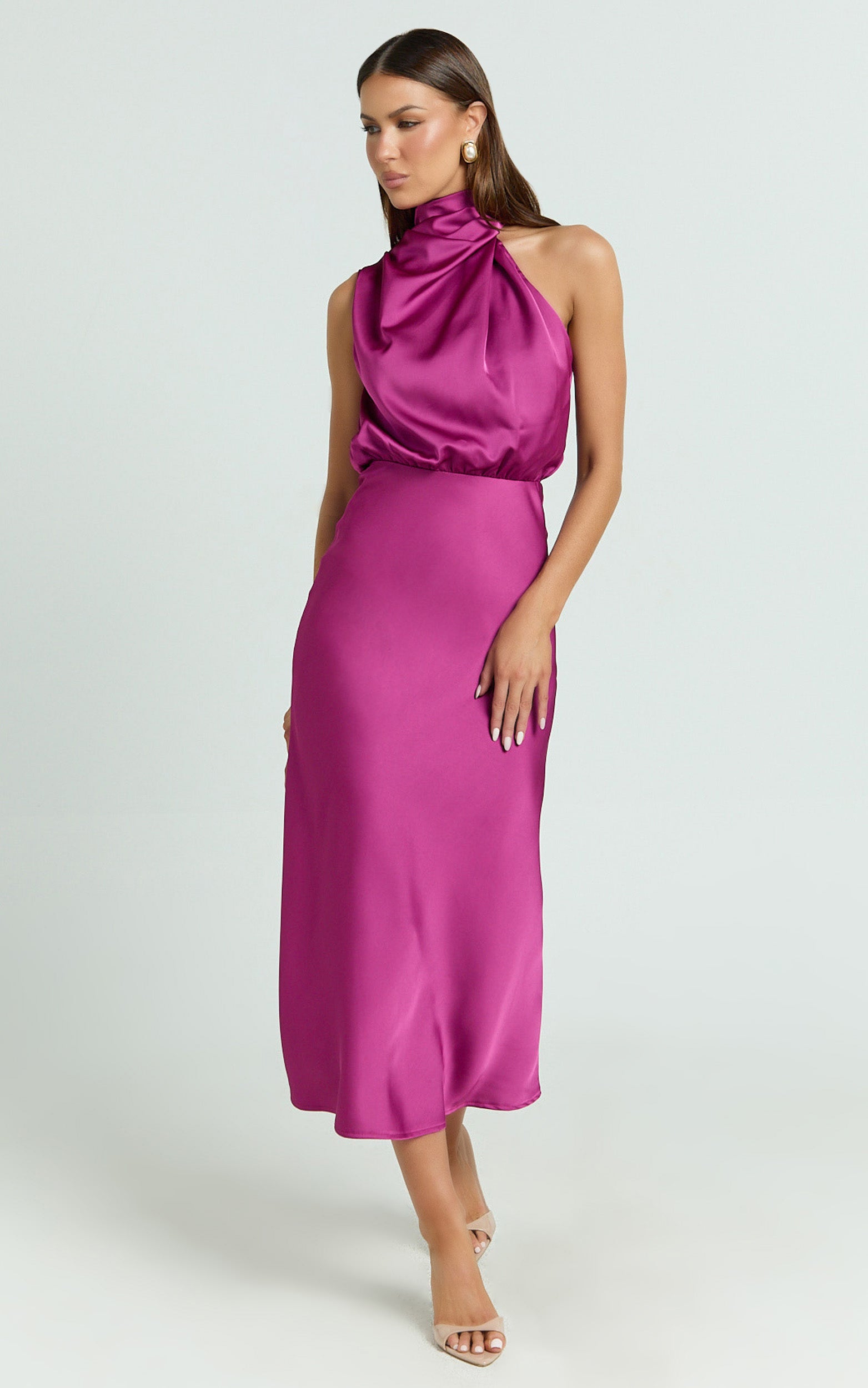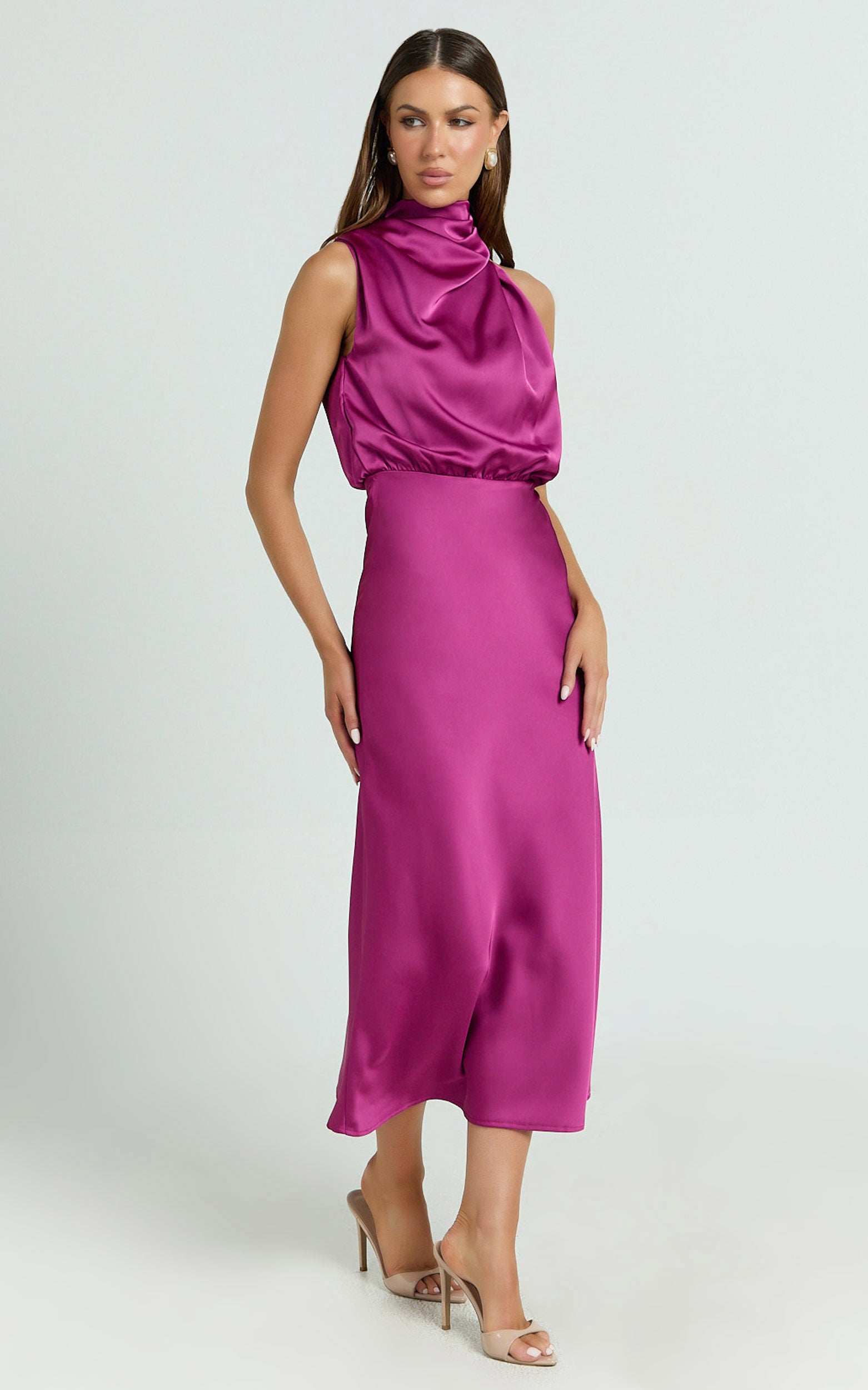 Effortlessly elegant, the Minnie Midi Dress is a luxurious addition to your wardrobe. The drape neck design creates a flattering silhouette that skims over your curves in all the right places, while the smooth satin fabric adds a touch of glamour. This gorgeous purple slip dress is perfect for any occasion - from cocktail parties to weddings and even as bridesmaids dresses.