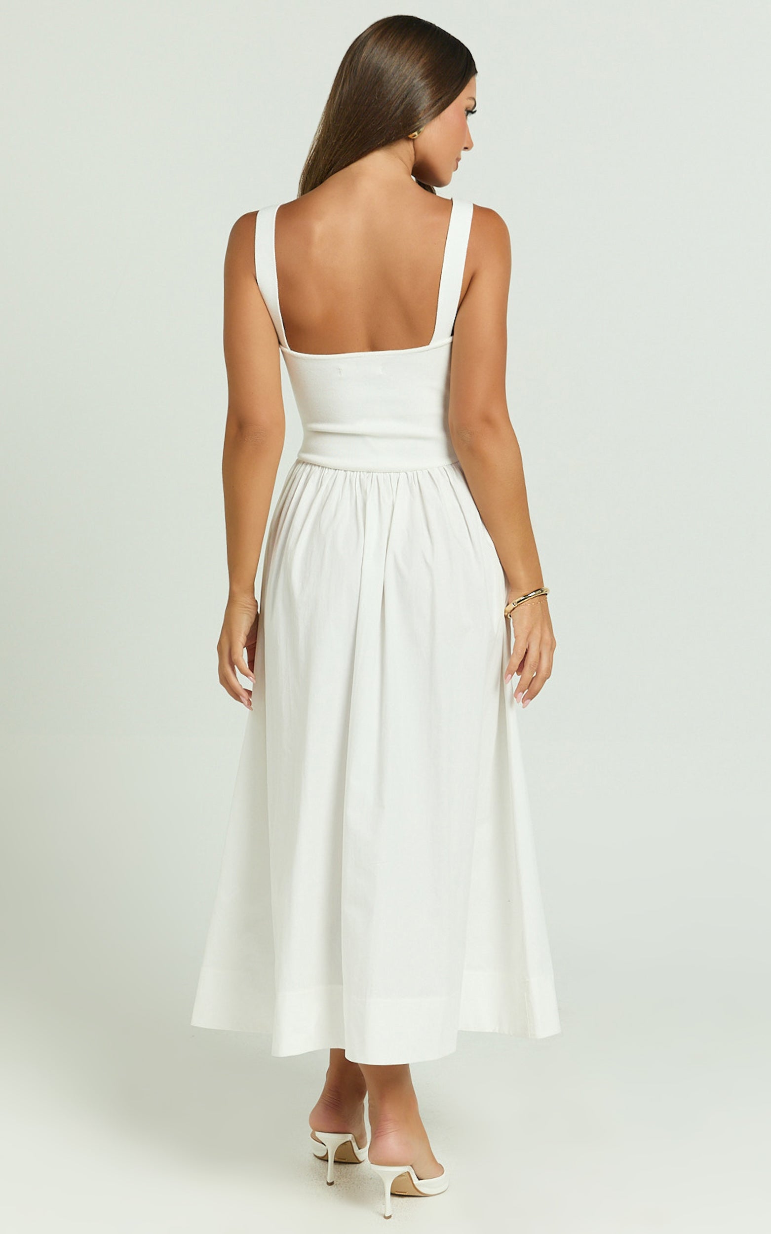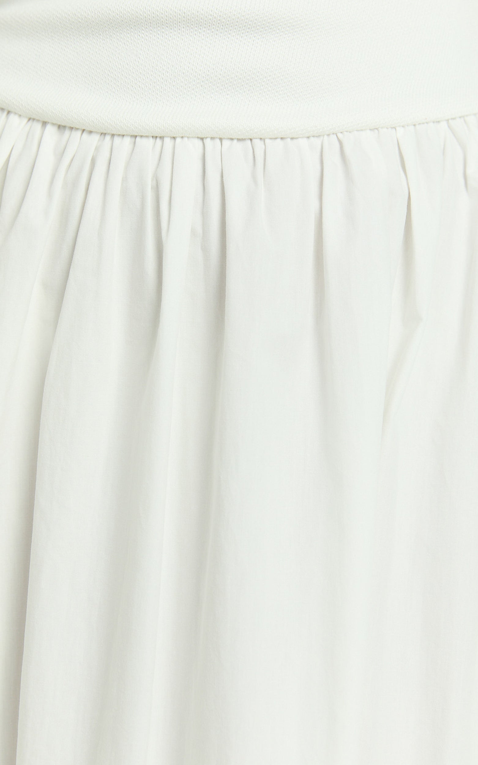 Effortlessly chic with minimalist vibes and a playful touch of street style, this white midi features a soft scoop neckline and a flattering straight drop waist, finished with a gathered poplin skirt to amp up its charm. Versatile enough to become your go-to choice, it's perfect for everything from weekend brunch dates to casual hangouts.