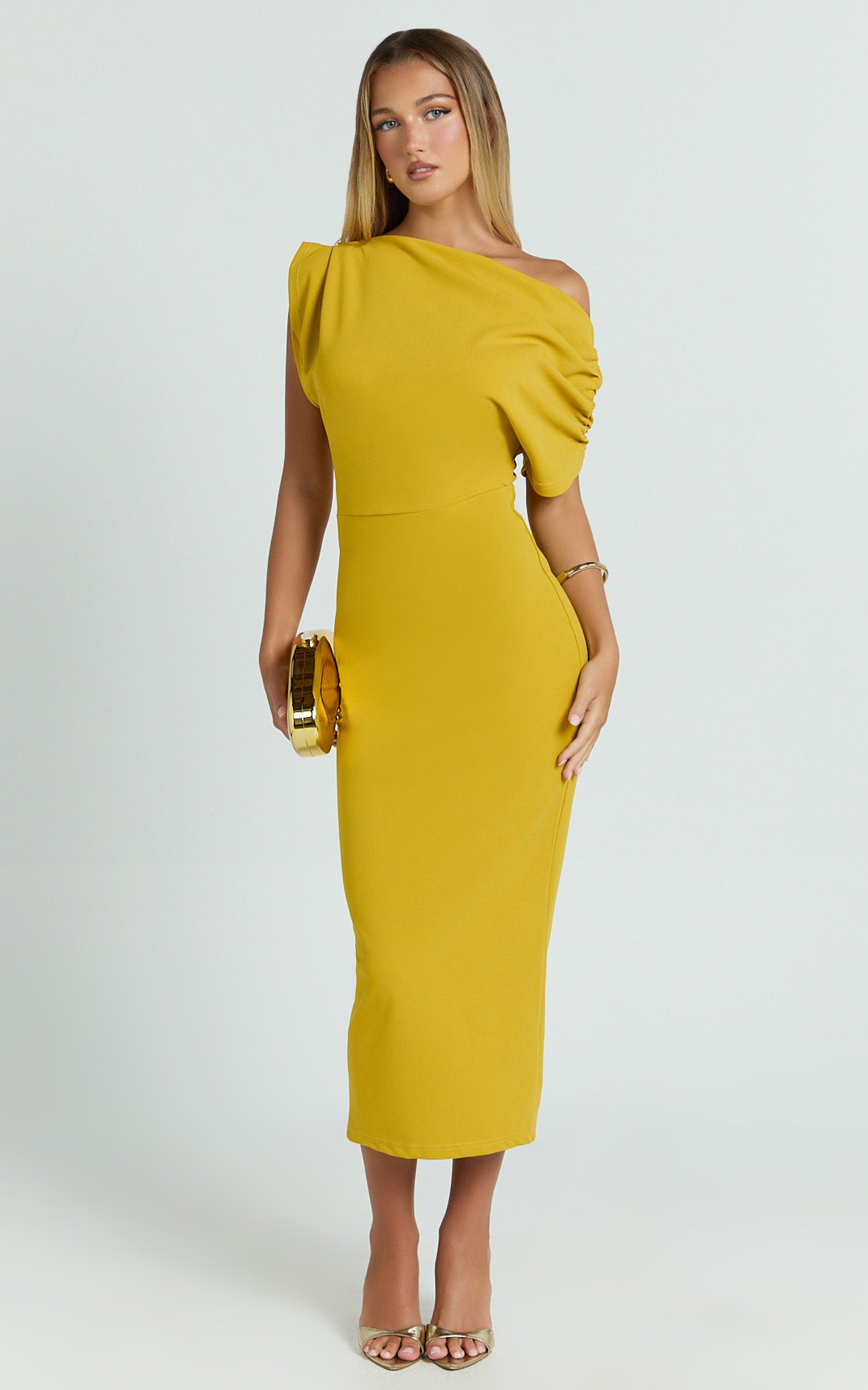 This tipped shoulder jersey drape silhouette skims and flatters with effortless flow, bringing a bold hit of yellow that turns heads from brunch to birthday. A chic midi length keeps it polished, while the asymmetric drape adds that flirty, photo-ready moment for Dresses that do the most with zero effort.