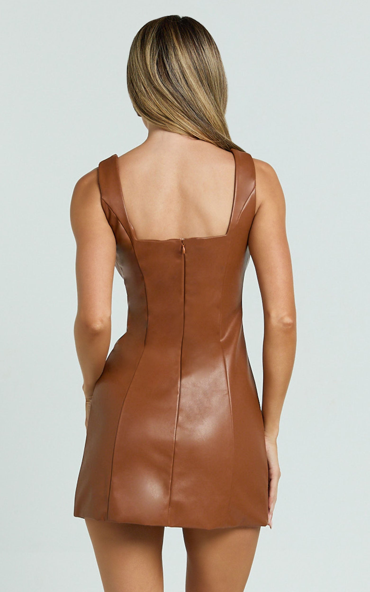 Nami sets the tone for elevated outfitting with a subtle nod to Maximalism through statement hardware and a leg-lengthening mini cut. Style it with strappy heels and a compact shoulder bag to keep the focus on the silhouette, or add a trench for crisp evenings. The Nami Mini Dress - Faux Leather Square Neck Gold Button Dress In Camel is your go-to when you want refined, runway energy without the fuss.